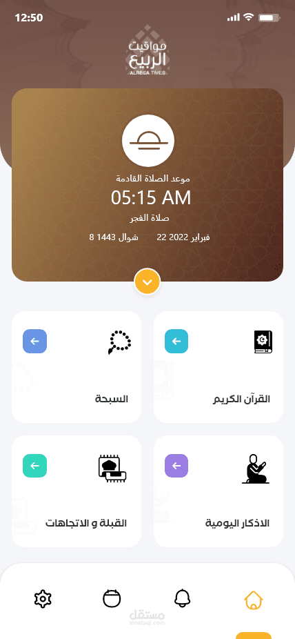 شاشات متنوعة تشمل القرآن الكريم، السبحة، الأذكار، البوصلة والقبلة، التنبيهات، وأهم المناسبات.