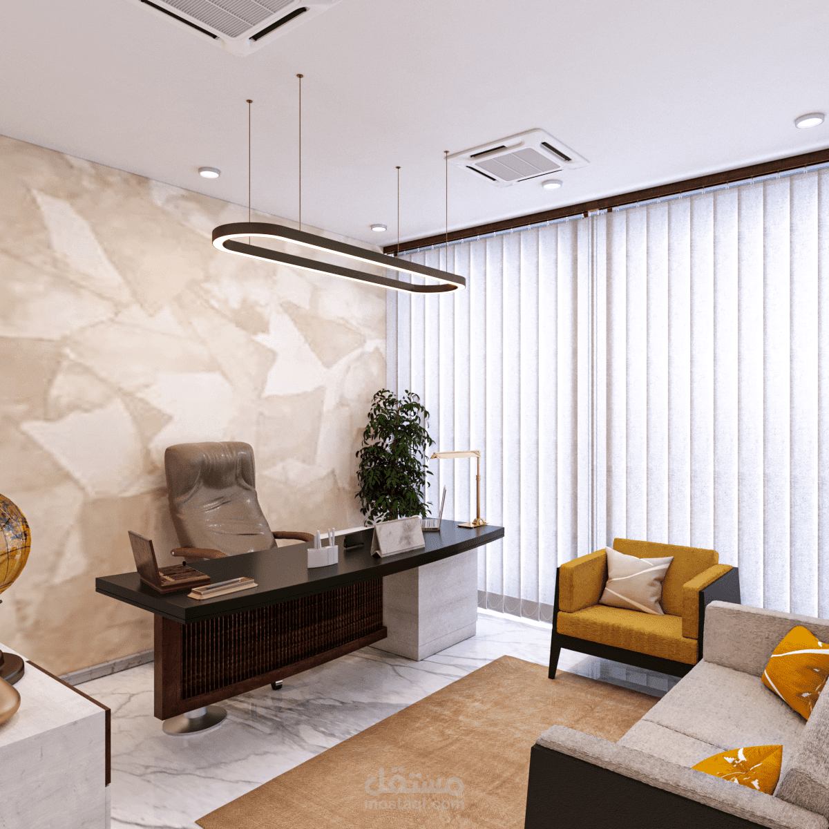 ومع الخشب المعالج تم ادراج اللون الاصفر ليتناسب مع شعار المكتب و الهوية البصرية.