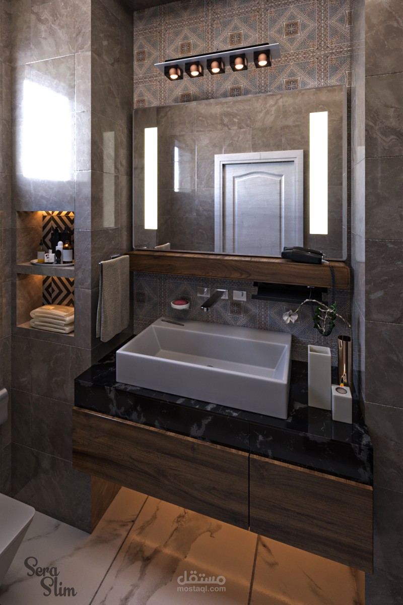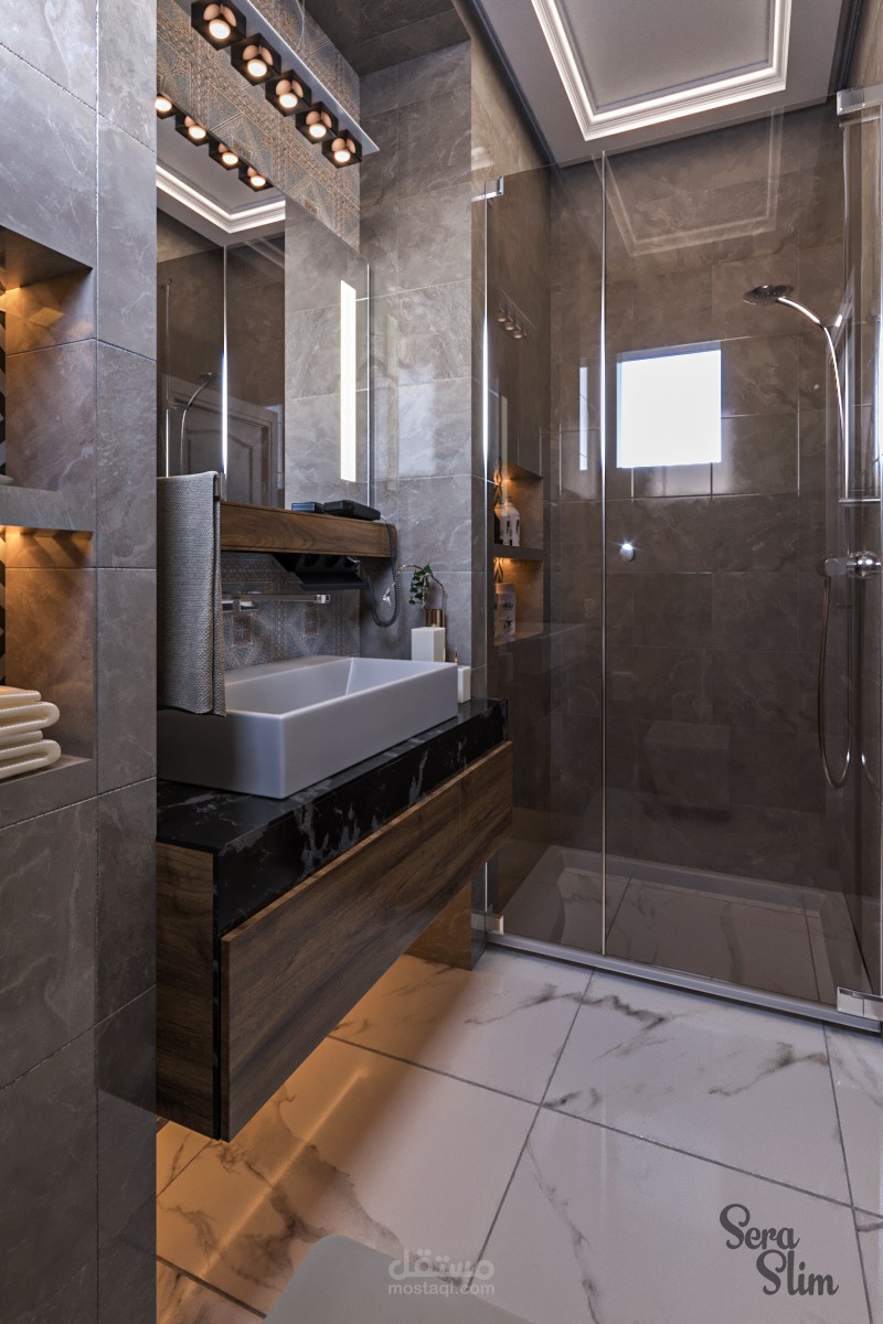 تصميم حدث للحمام استخدمنا فيه رخام كلاكتا للحوائط و الرخام الابيض في الارضيات ....