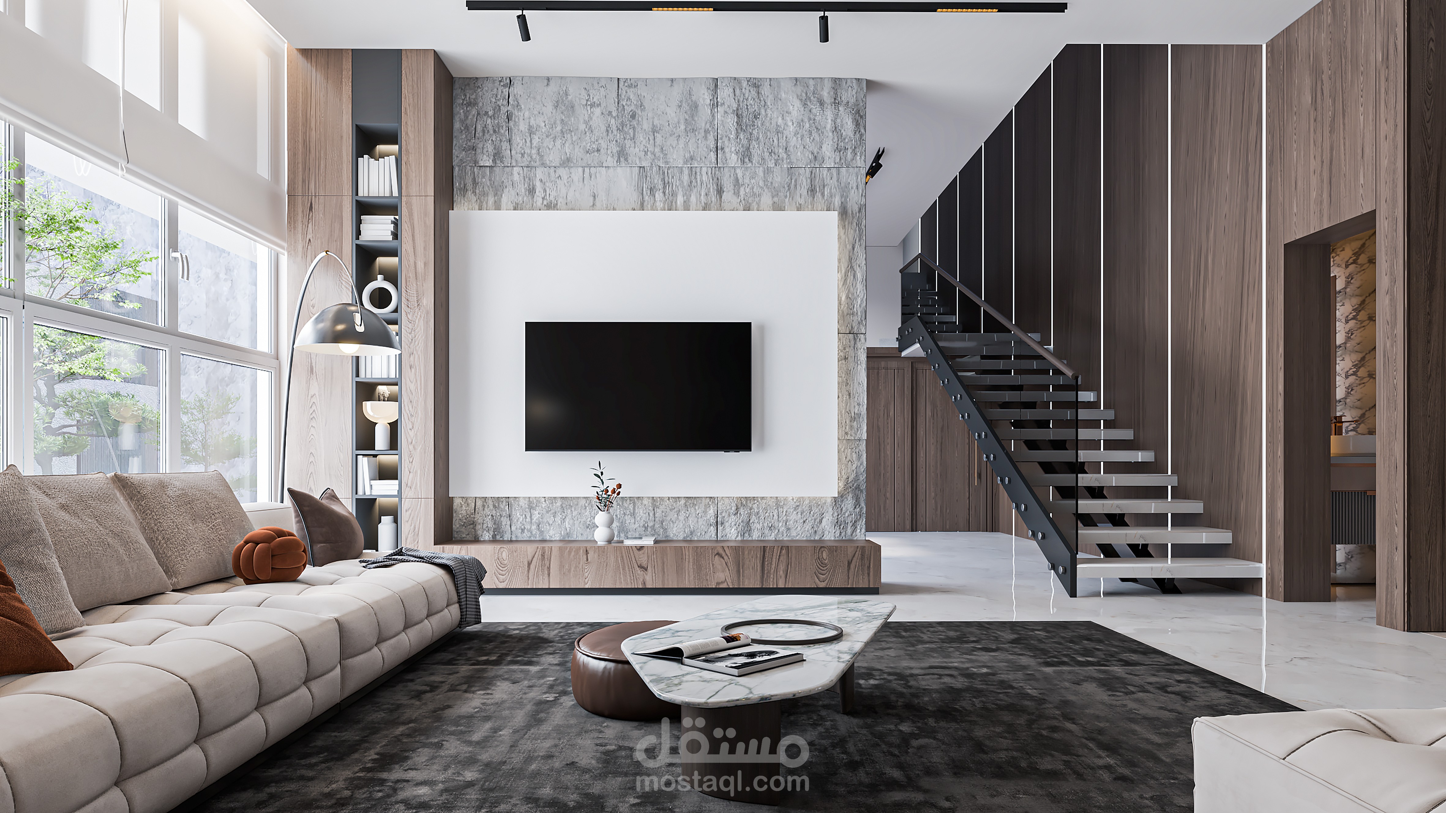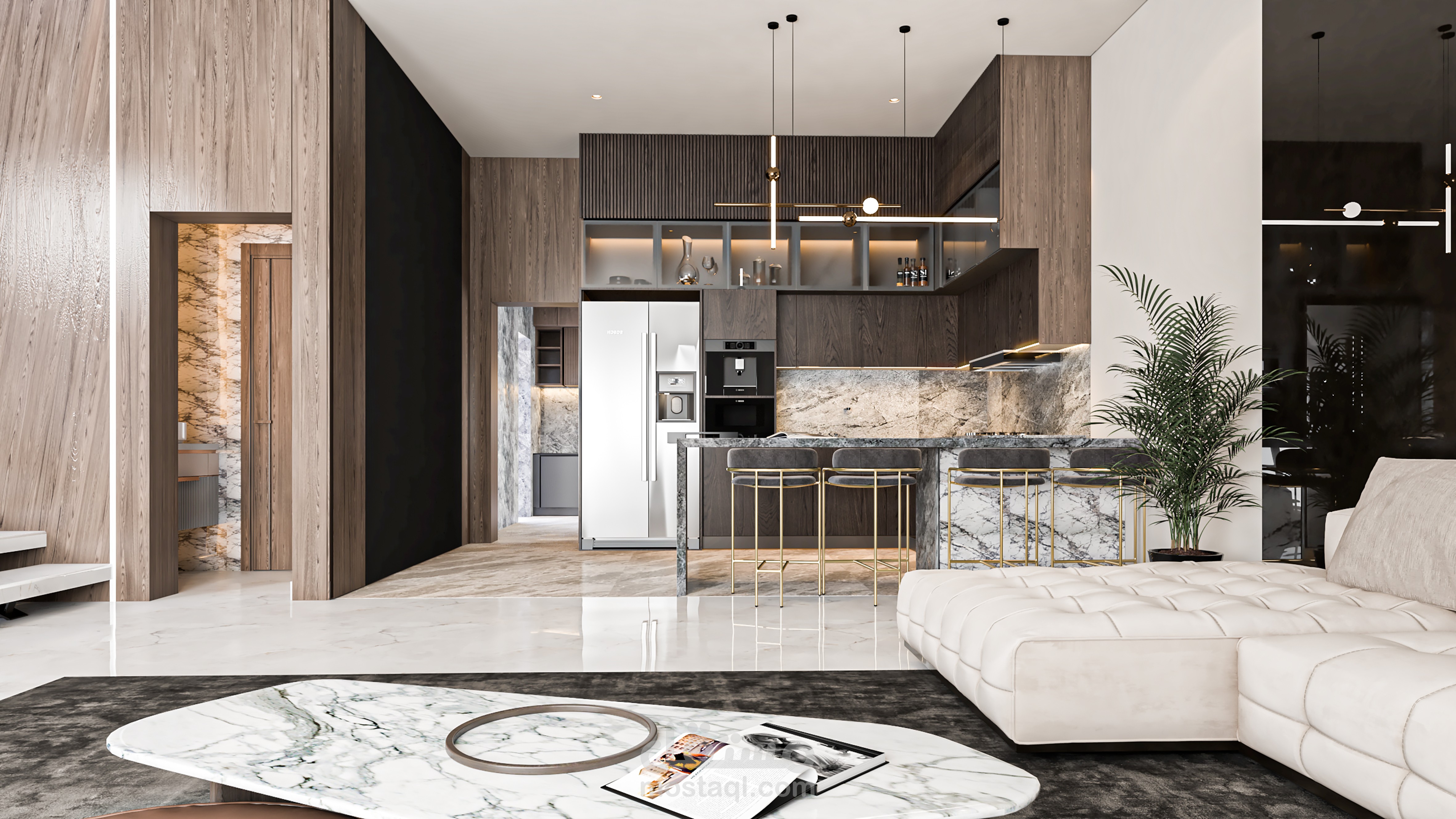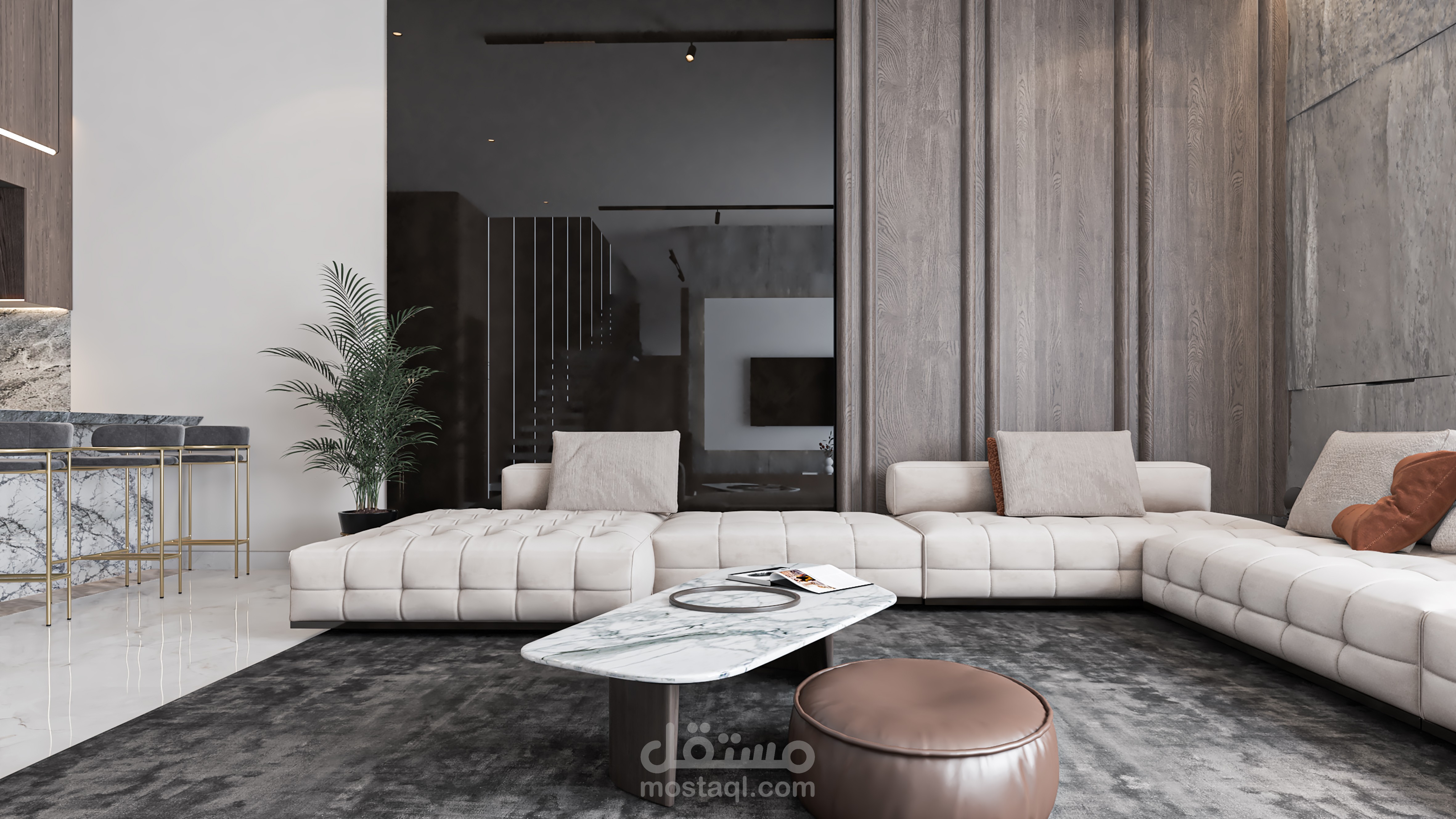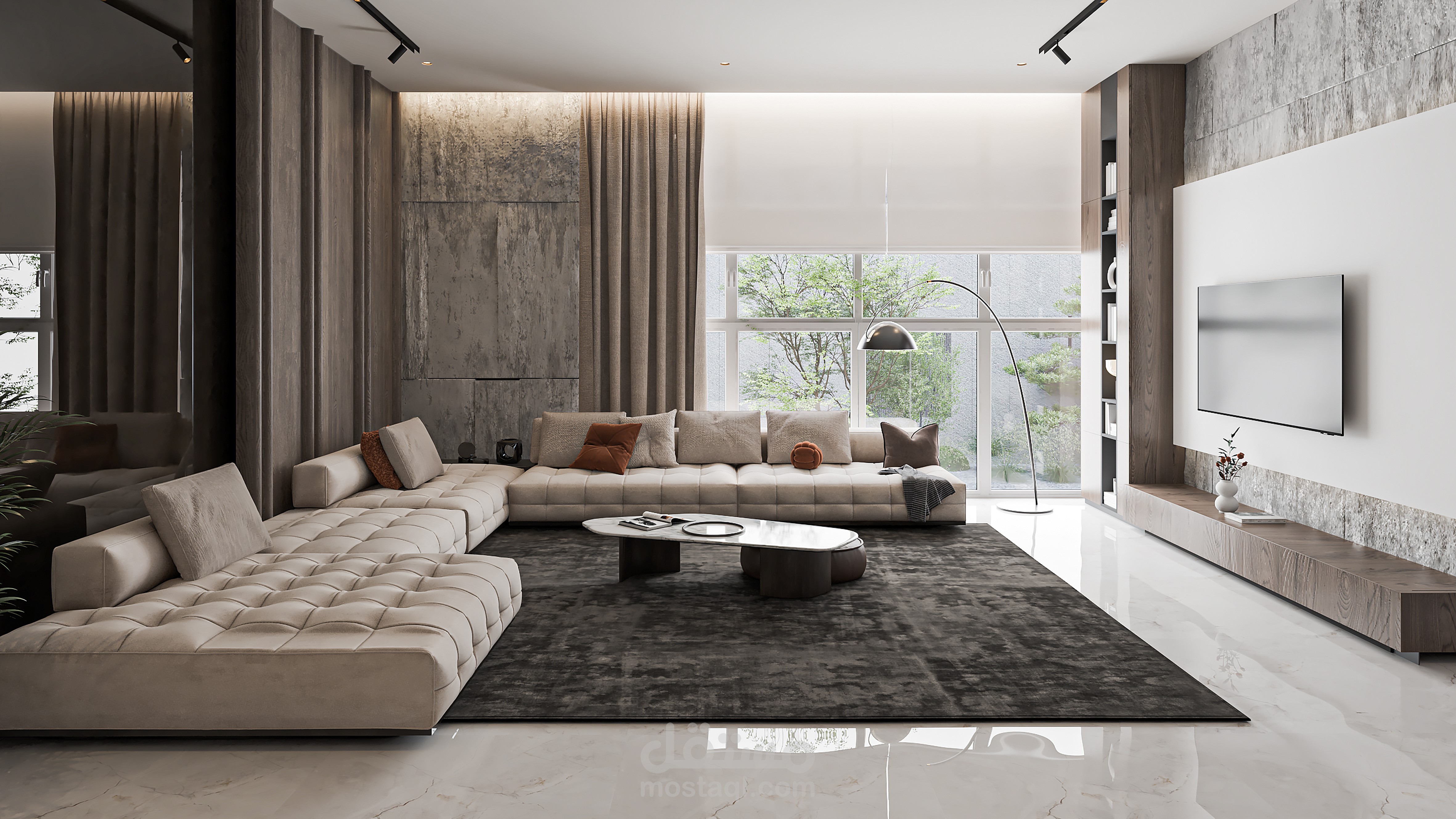 تصميم صاله مفتوحه باستايل بسيط وبألوان هادئه