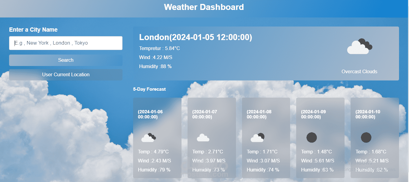 لوحة تحكم لتطبيق الطقس. يسمح للمستخدم بإدخال اسم مدينة لعرض الطقس الحالي والتنبؤات لمدة 5 أيام. تتمثل هيكلة الصفحة الرئيسية في عناصر HTML لإدخال البيانات وعرضها بالإضافة إلى أنماط CSS للتنسيق.