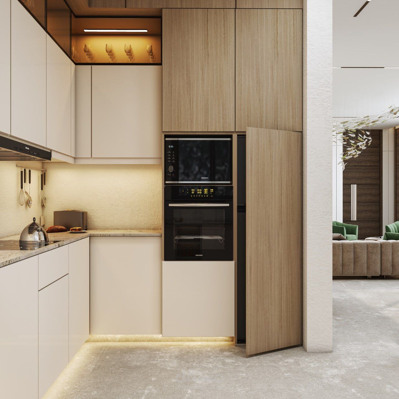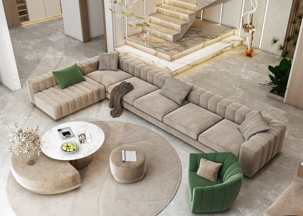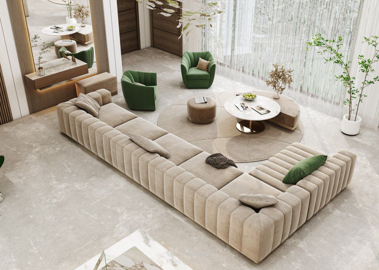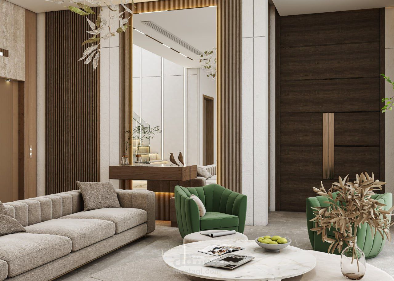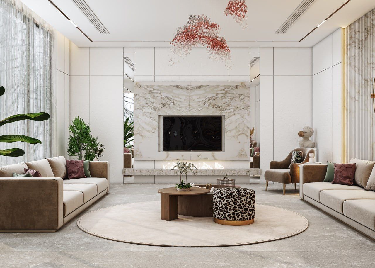 A modern living room epitomizes chic sophistication with clean lines and open space. Neutral hues and textures harmonize, accentuating contemporary furnishings. Ambient lighting and sleek accents create an inviting atmosphere. Smart integration and artistic details elevate its functionality and aesthetic appeal, fostering a stylish yet cozy ambiance.