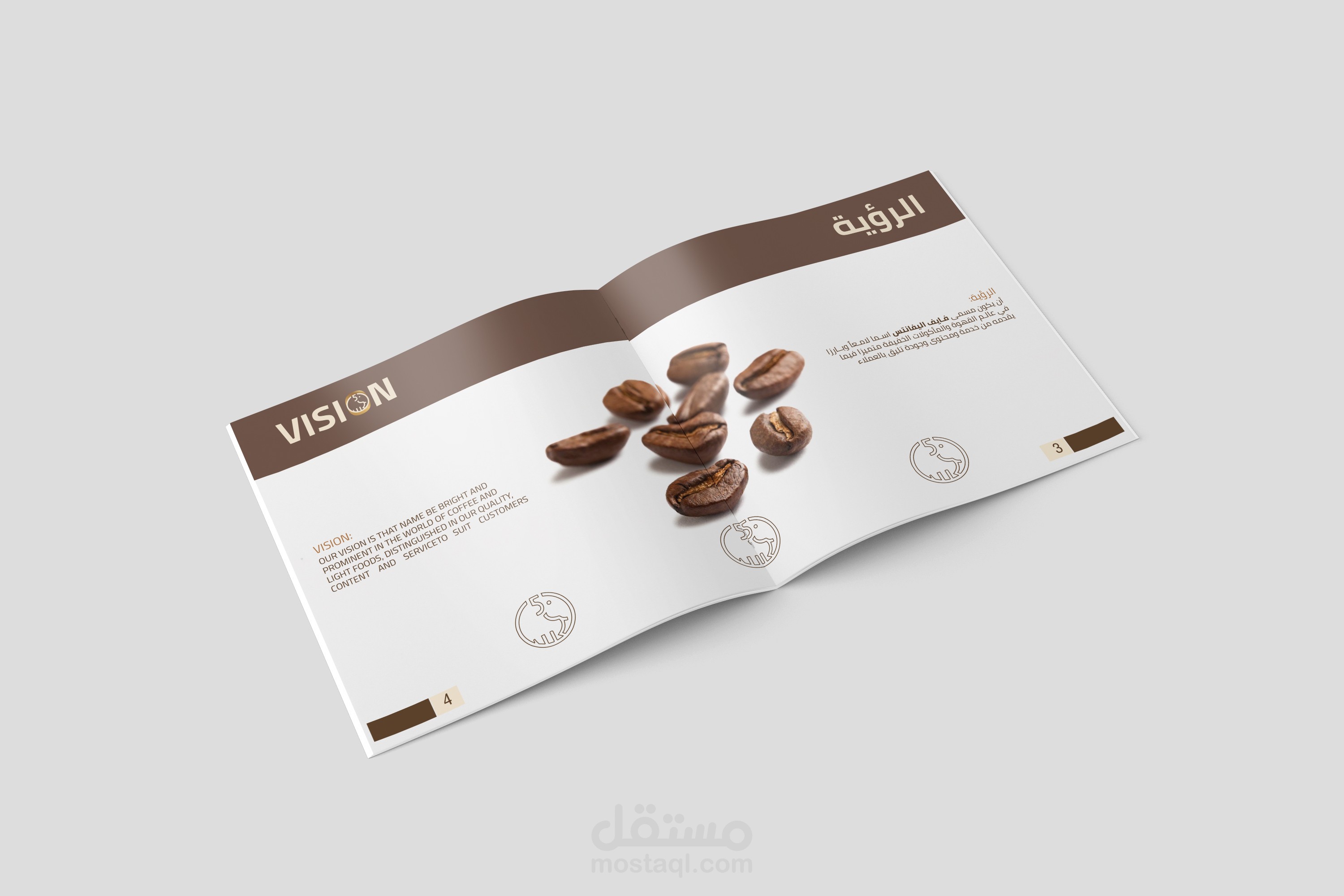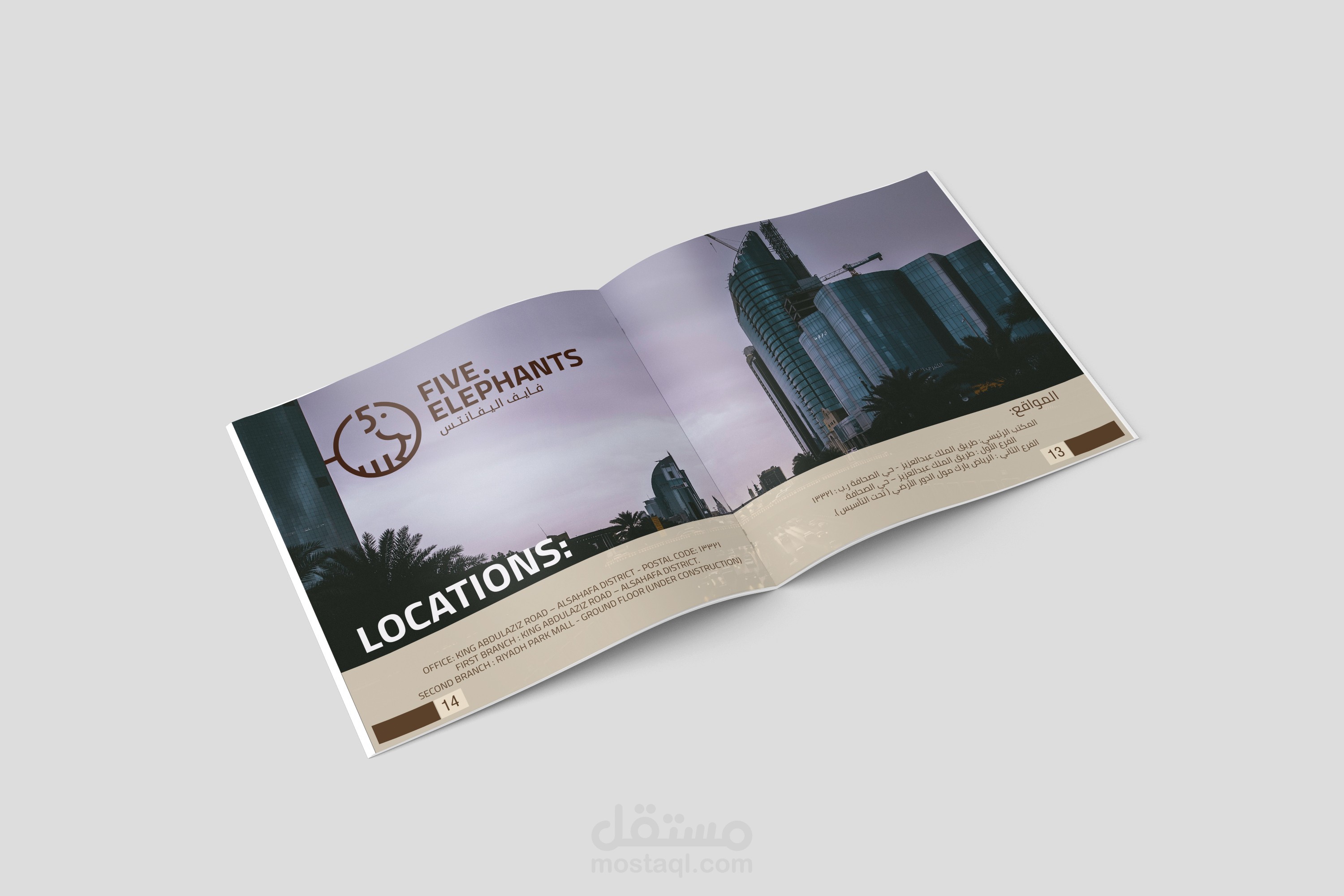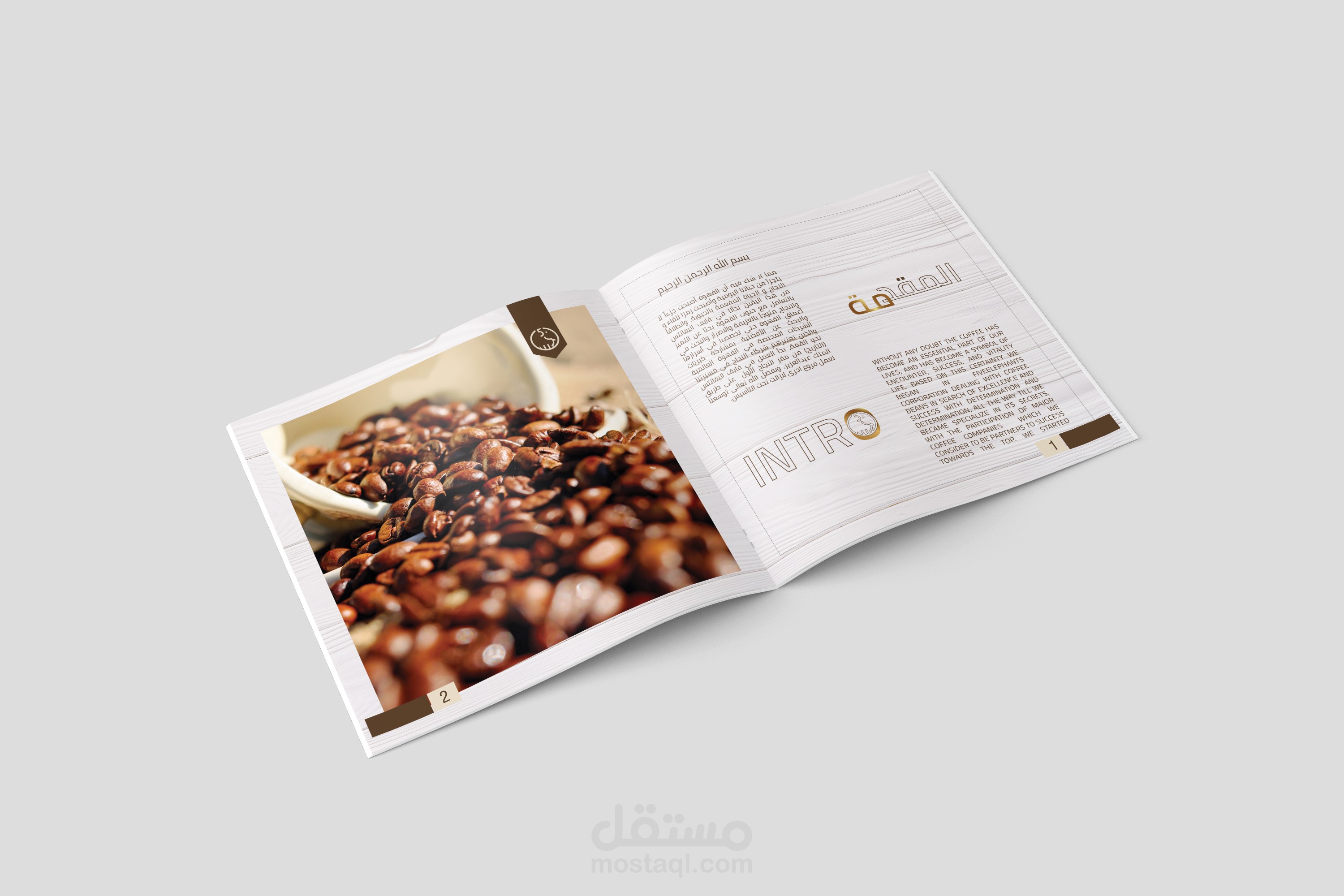 تصميم كومباني بروفايل لشركة فايف اليفانتس المختصة بالقهوة. عملت على تصميم جذاب بألوان متعلقة بصناعة القهوة وصور عالية الجودة وقابلة للطباعة.