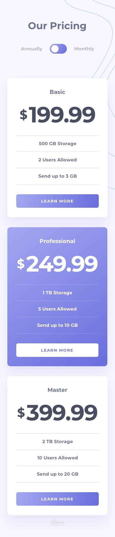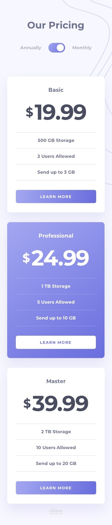هذه صفحة تحتوي على 3 خيارات للدفع وهي متفاعلة (responsive web design) مع الأحجام المختلفة للأجهزة وخصاصا الهواتف والحواسيب، ويمكنك تغيير عرض الأرقام بين الشهرية والسنوية بضغطة زر.
