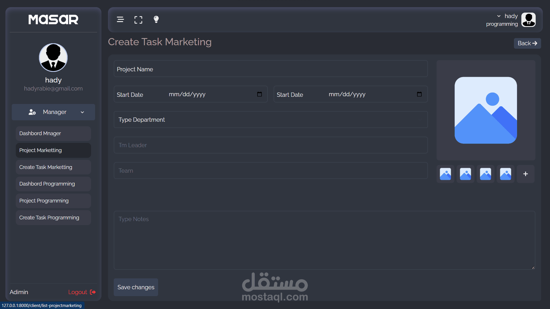 - صفحة لإنشاء المهام وتحديد عدد الموظفين الذين يجب أن يعملوا على هذا المشروع وتحديد وقت البداية ووقت الانتهاء وإدراج جميع الملفات والصور اللازمة للموظف.