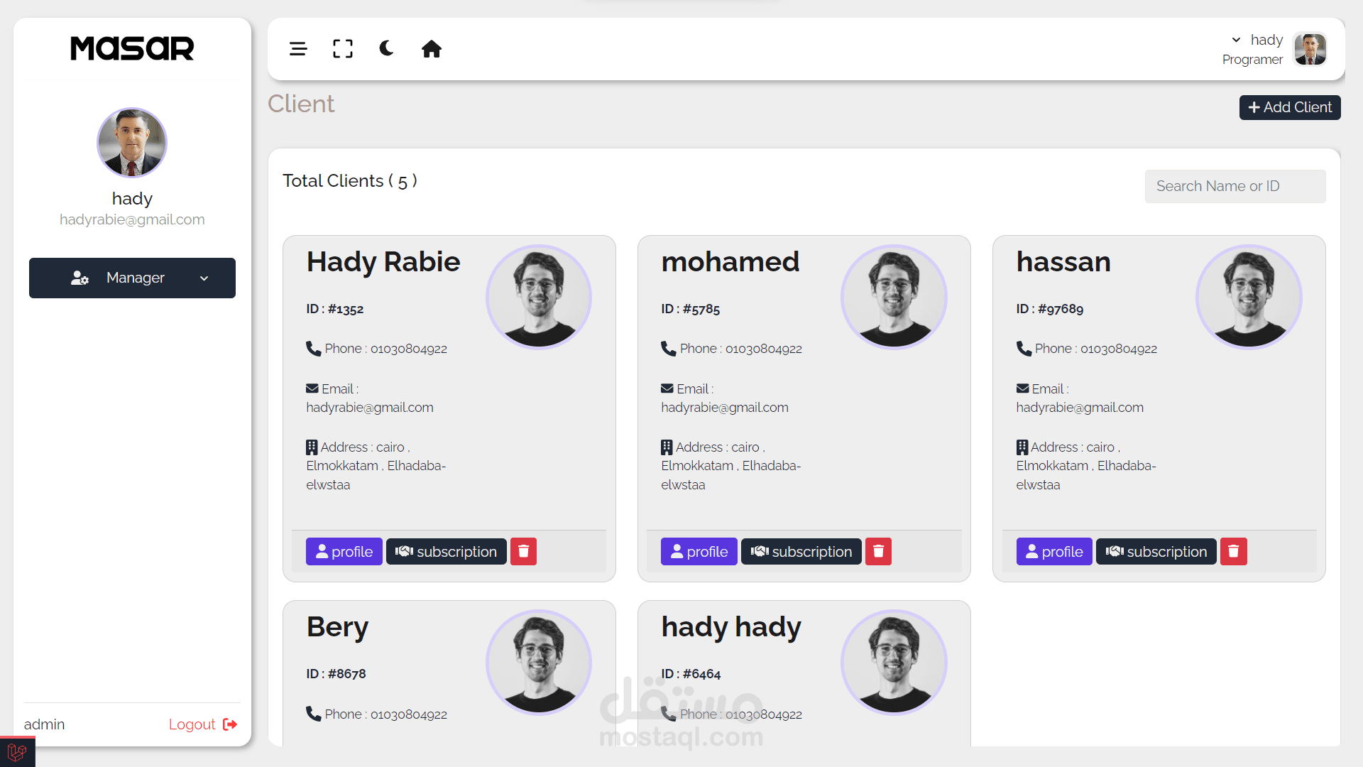 - صفحة لعرض جميع العملاء وإمكانية الاشتراك في خطة ومتابعة تفاصيل الخطط التي قام بالاشتراك بها.