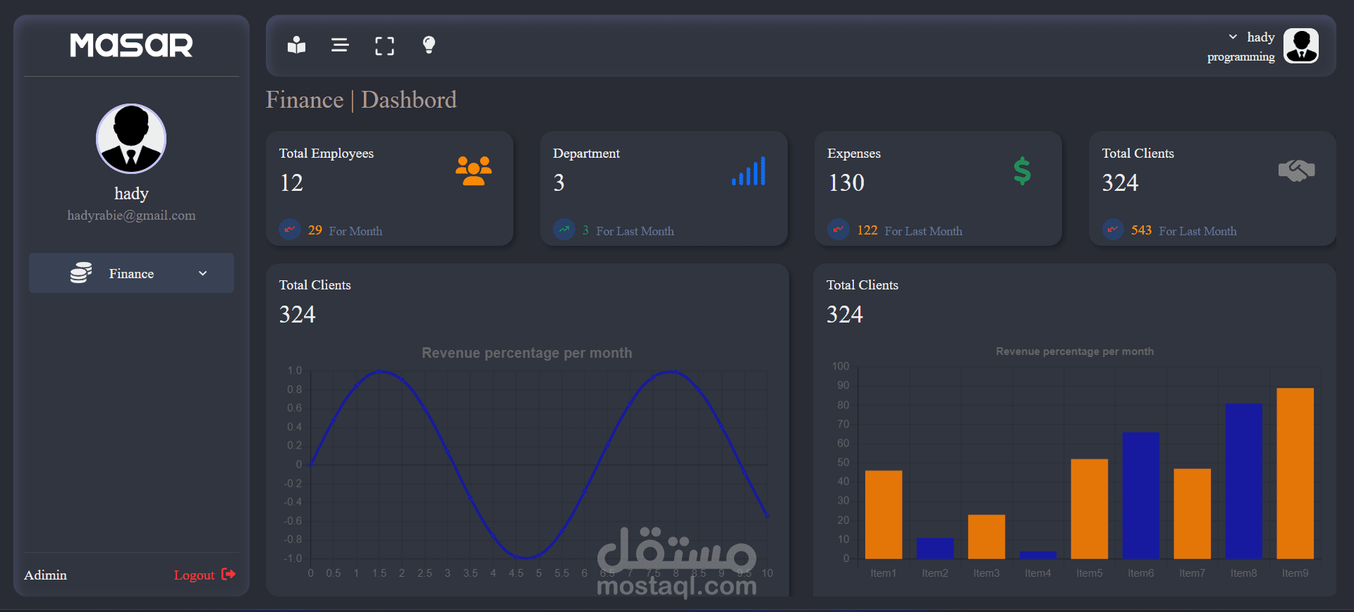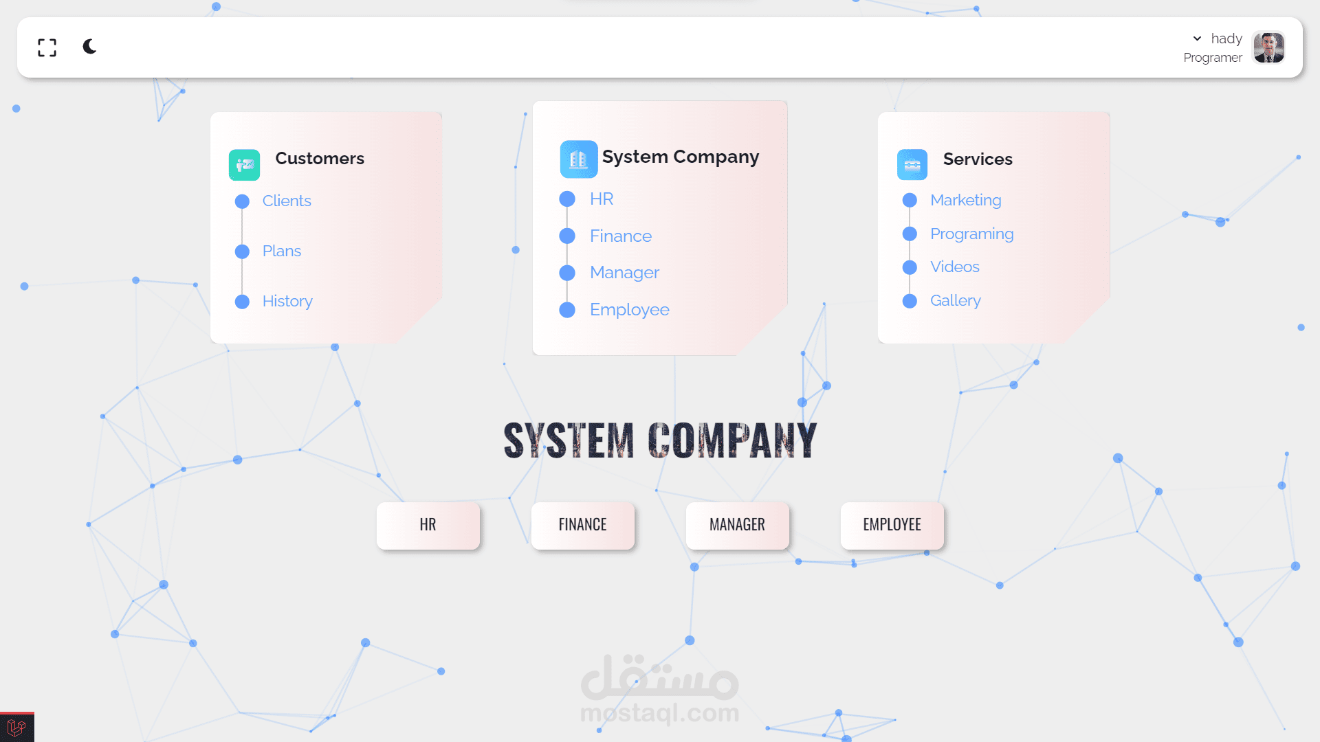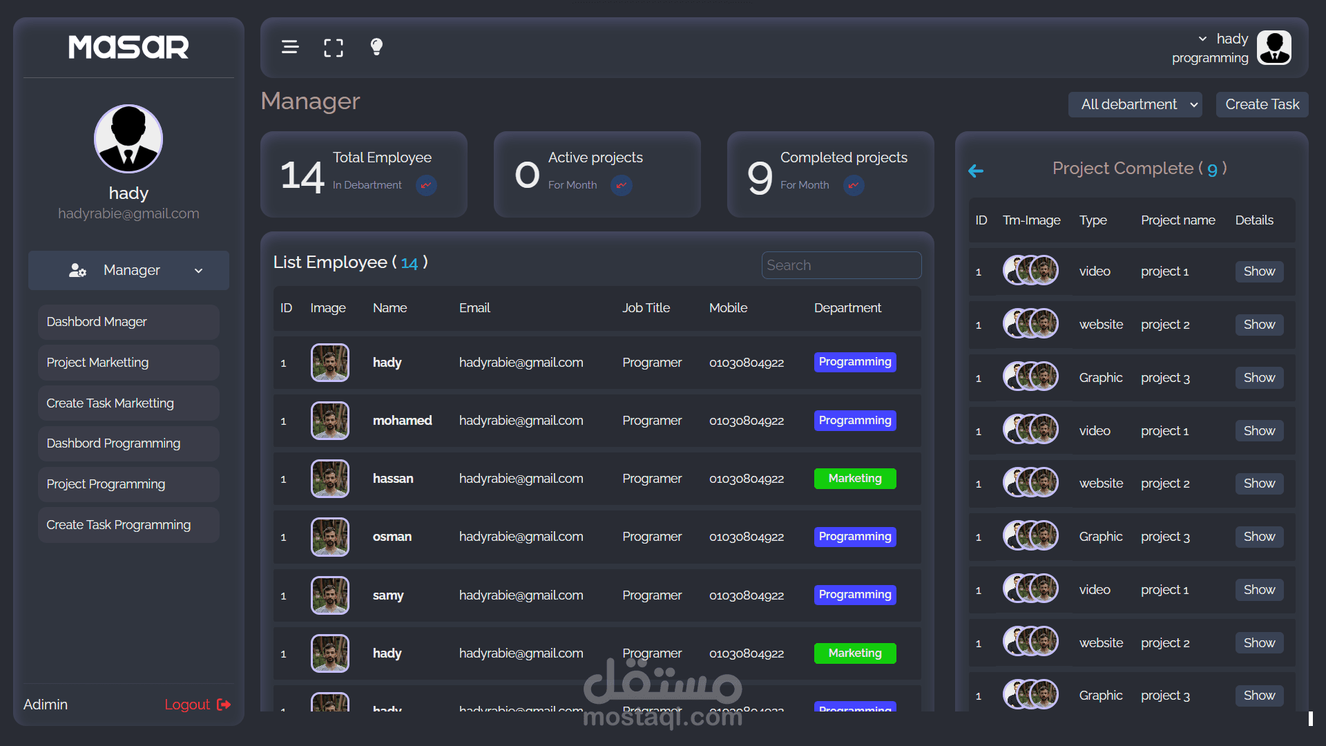 - صفحة لإدارة الموظفين الخاصة بالقسم فقط وعرض إجمالي المهام المكتملة وإجمالي المهام قيد التنفيذ وإجمالي الموظفين الخاصة بالقسم.