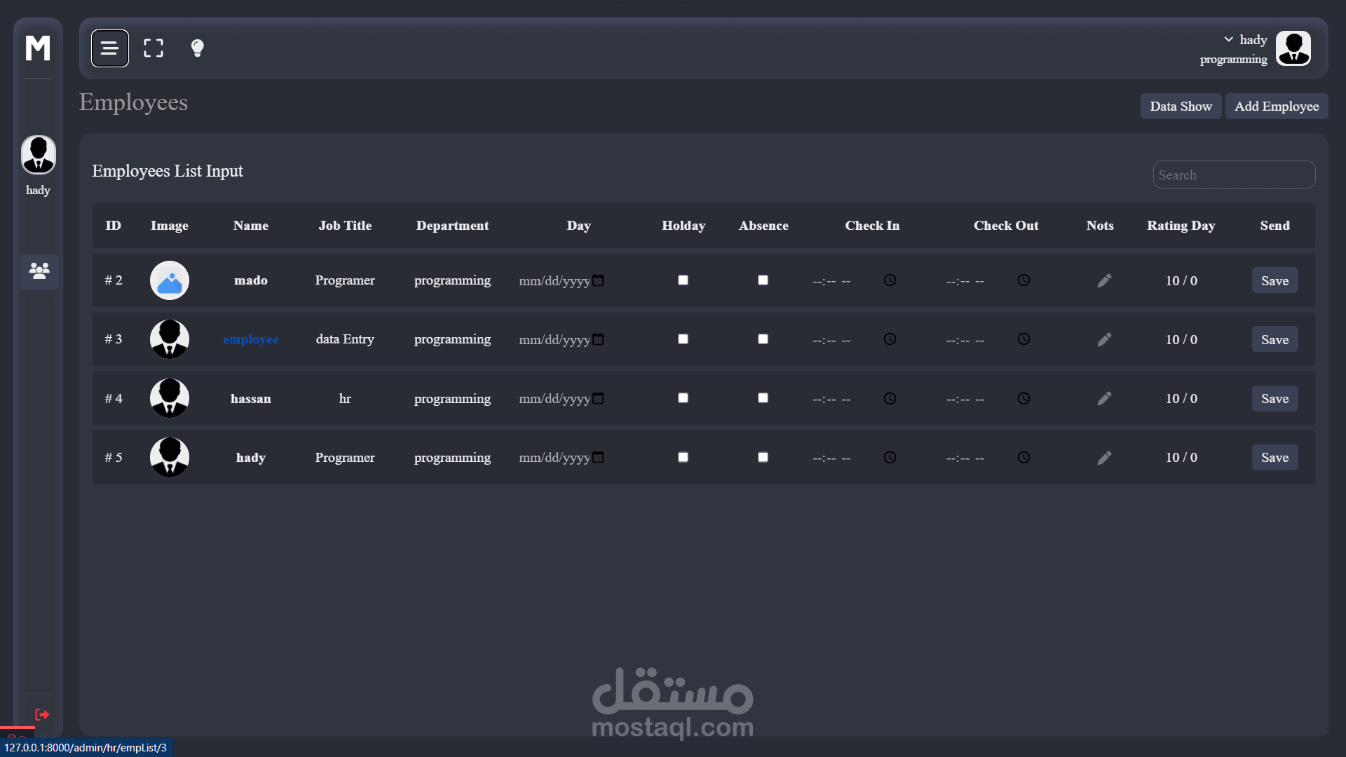 - صفحة إدخال البيانات اليومية للموظفين مثل الحضور والانصراف والغياب والإجازات والتقييمات.