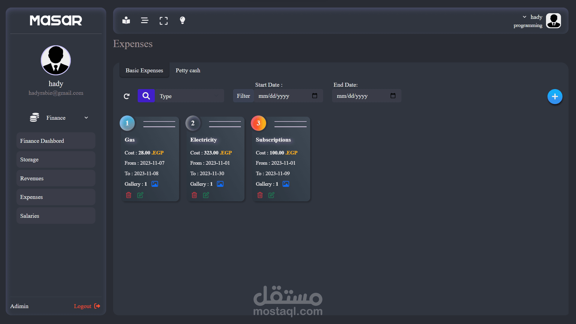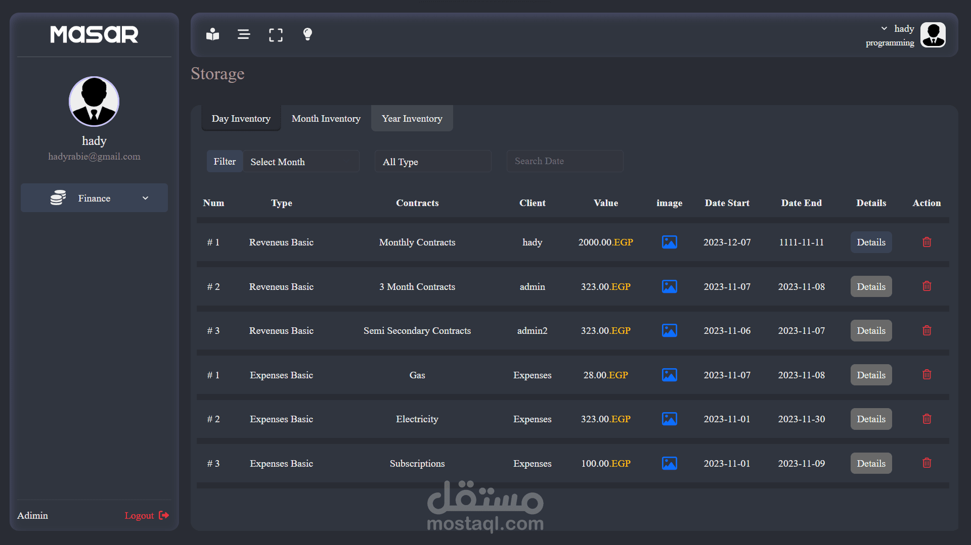 - صفحة المصروفات تشمل جميع العقود النثريات وغيرها من المصروفات.