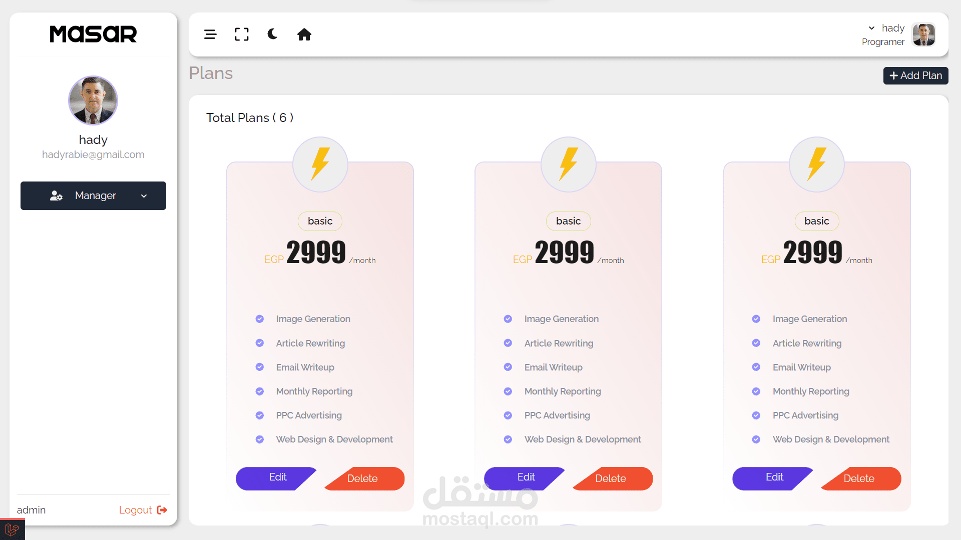 - صفحة لعرض جميع الخطط والاشتراكات وتحديد سعرها والتعديل عليها.