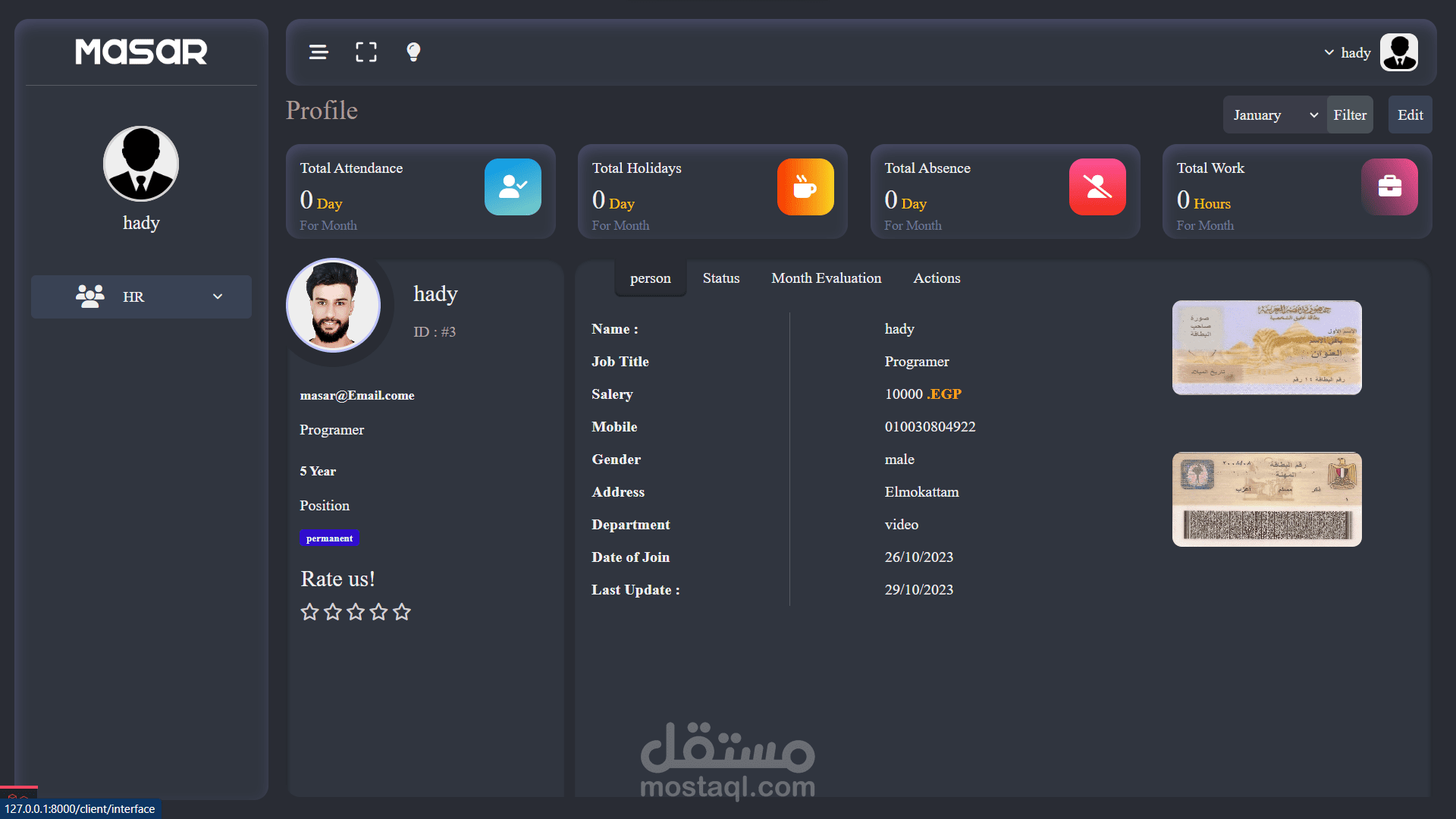 - صفحة لعرض عدد ساعات العمل في الشهر والسنة وعدد أيام الغياب والإجازات والحضور.