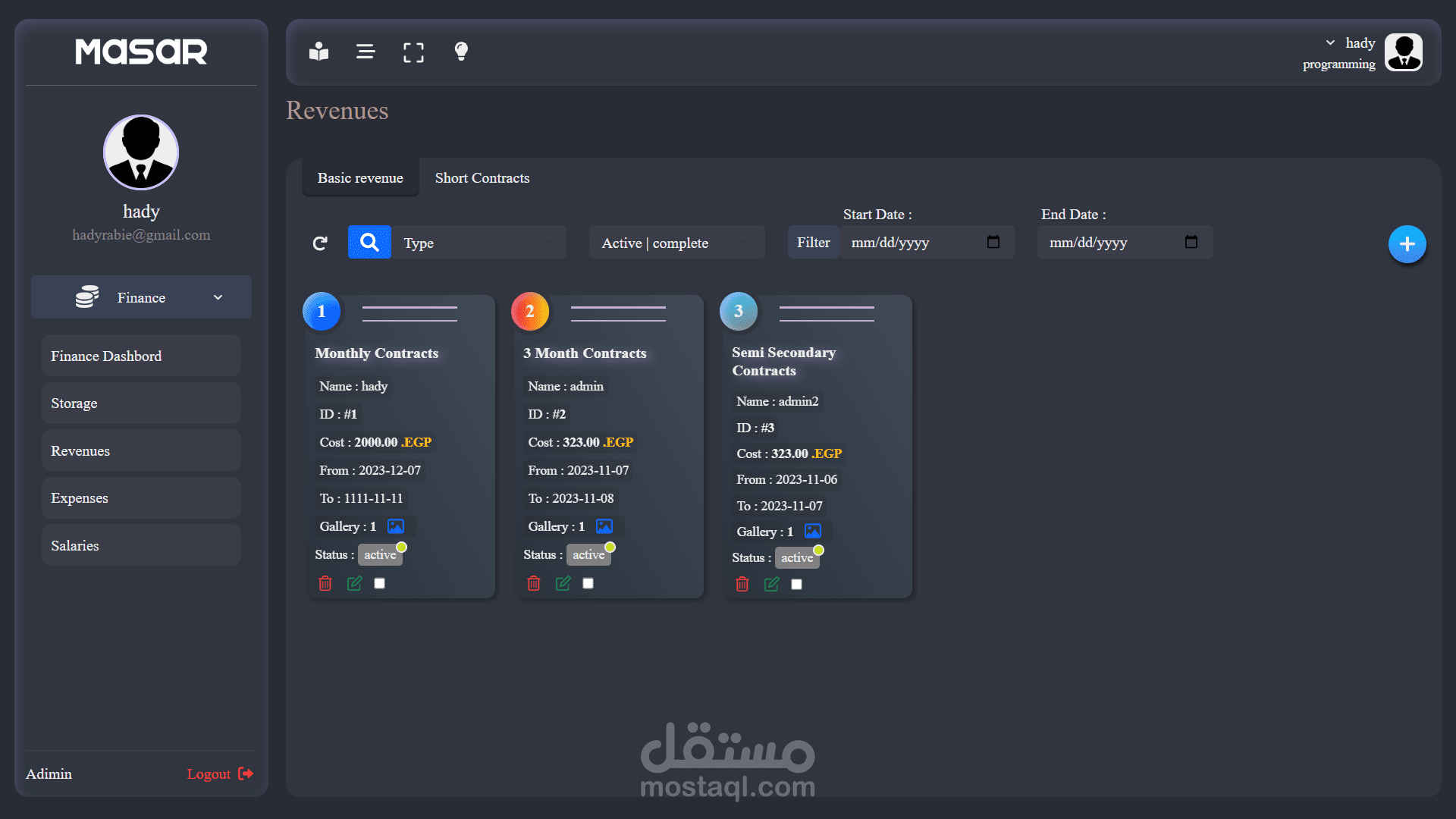 - صفحة الإيرادات لإنشاء العقود الشهرية والسنوية والنصف سنوية والأسبوعية وغيرها.