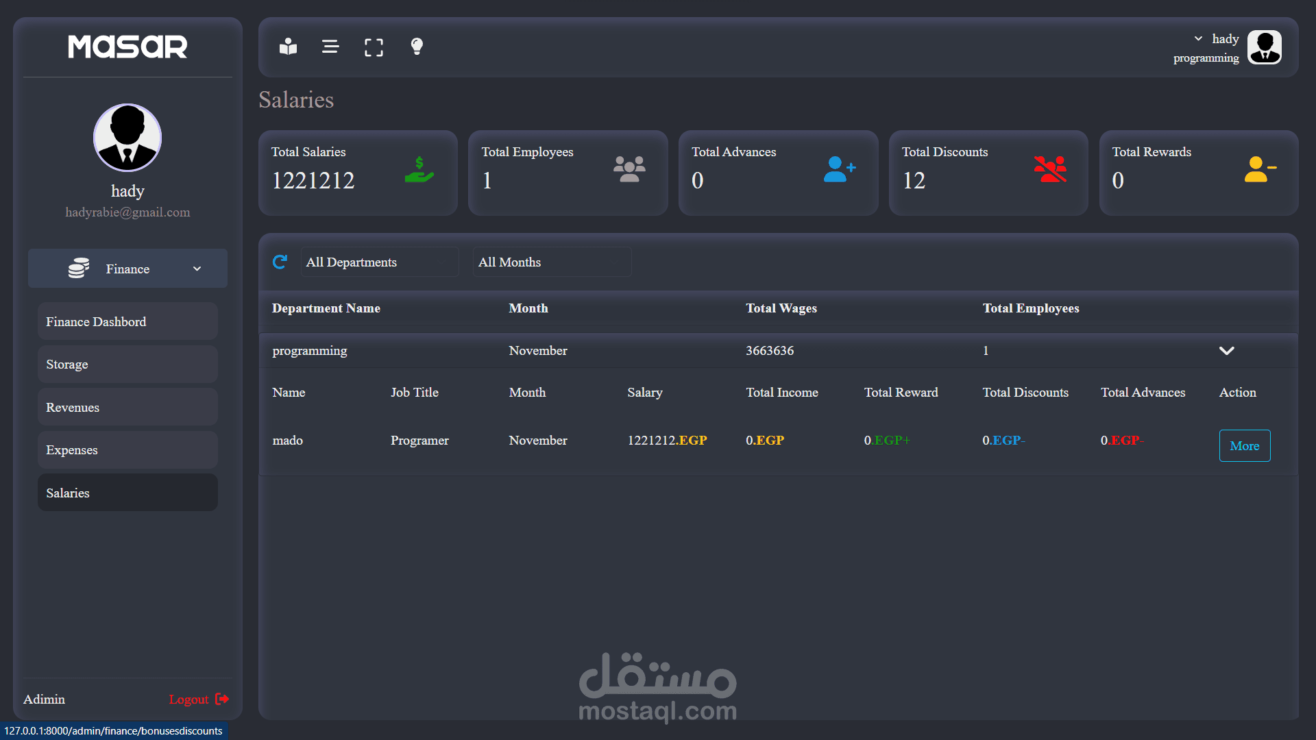 - صفحة مرتبات الموظفين والسلف والمكافآت والخصومات وصافي المرتب الشهري والتفاصيل اليومية.