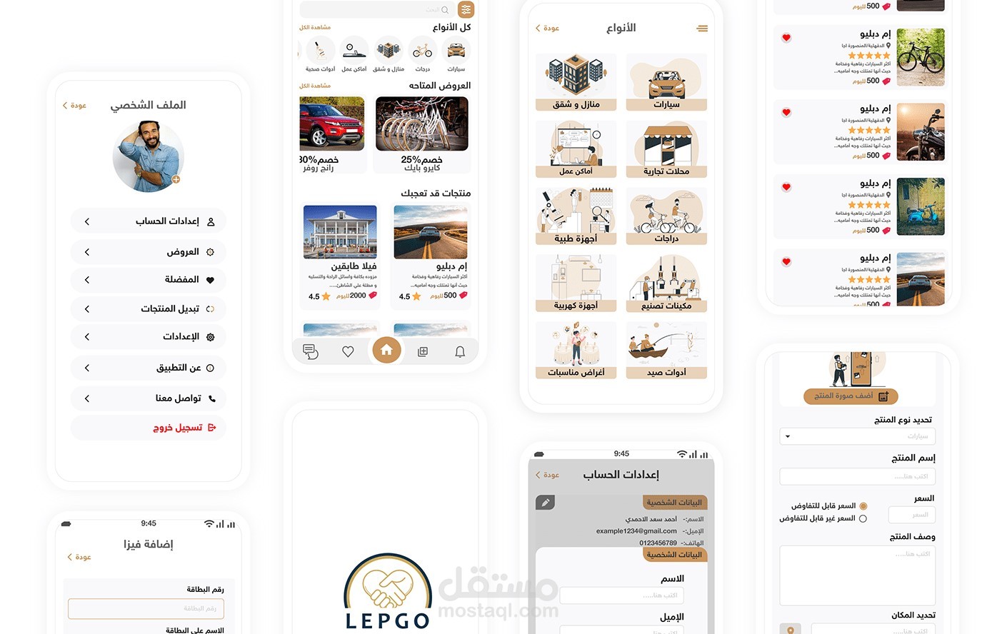 (LEPGO )عبارة عن تطبيق لتجارة الاليكترونية (ايجار وتبديل وبييع) تم العمل للحصول علي: •واجهة مستخدم جذابة وسهلة الاستخدام تجعل المستخدمين يشعرون بالرضا. • واجهة مستخدم تعكس علامة تجارية قوية وتقدم تجربة مستخدم رائعة. • التصميم يلبي احتياجات المستخدمين وتساعدهم على تحقيق أهدافهم. ادوات العمل adobe xd , Illustrator, Photoshop