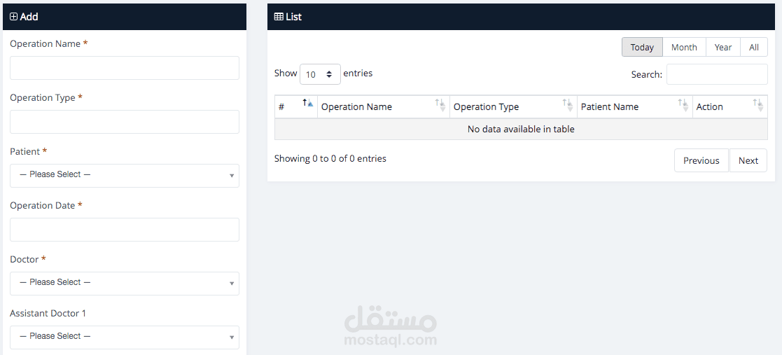 غرفة العمليات هي منشأة داخل المستشفى حيث يتم إجراء العمليات الجراحية في بيئة معقمة. تُعرف أيضًا باسم غرفة العمليات (OR)، أو جناح العمليات، أو جناح العمليات. تقوم هذه الميزة بإنشاء سجل لمريض العملية