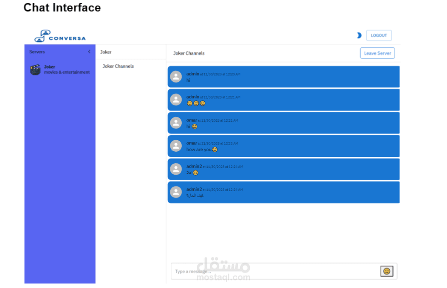تُعتبر خدمة الدردشة عبر موقع الويب هذه مشروعًا مبتكرًا يستخدم تقنية WebSocket لتمكين تفاعل سلس وفوري بين المستخدمين. يتم بناء الخدمة باستخدام إطار العمل Django للجانب الخادم ومكتبة React للجانب العميل.