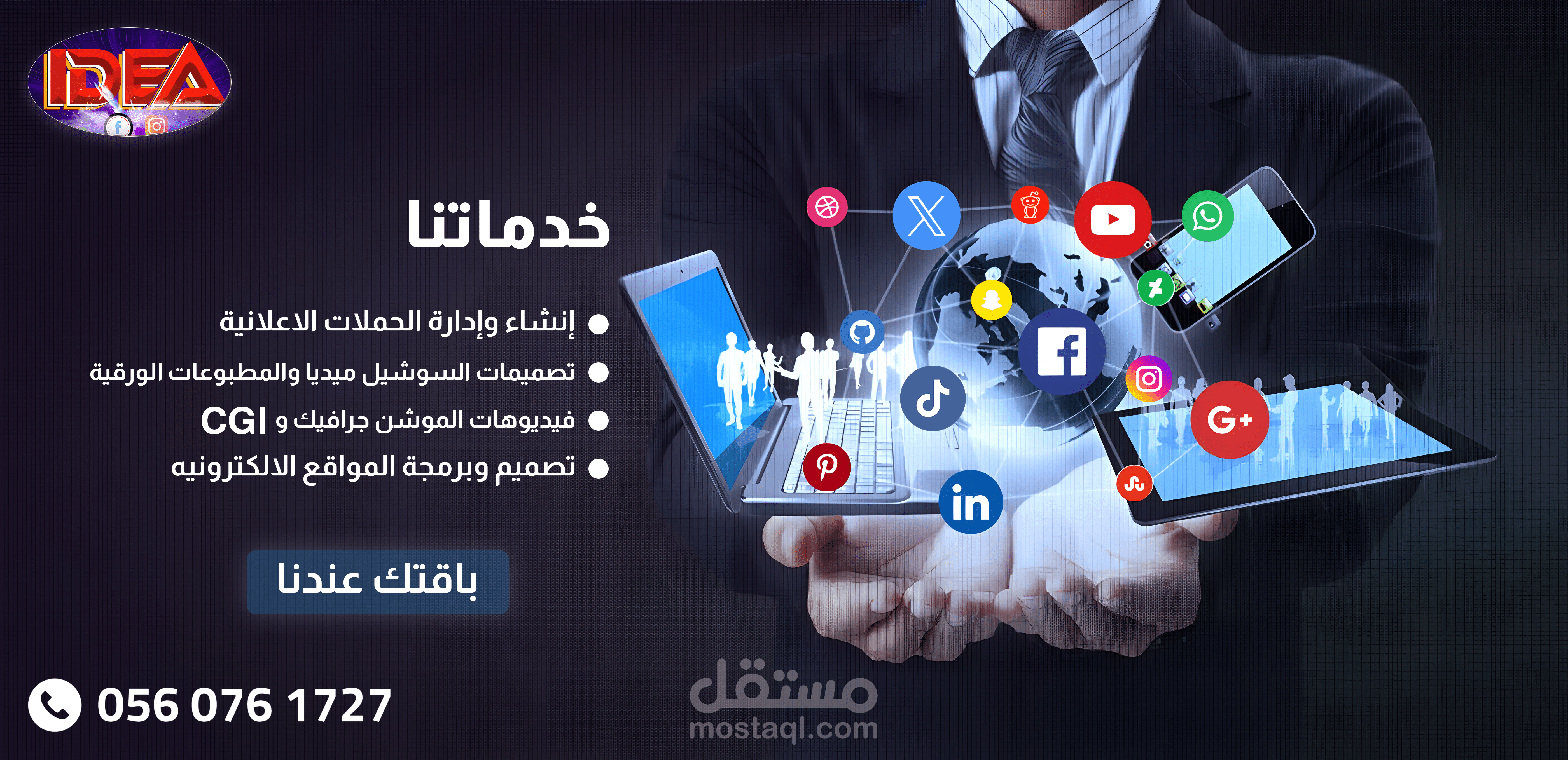 تصميم منشورات إعلانية احترافية لصفحة شركة IDEA لعرض خدماتها في التسويق الإلكتروني، والموشن جرافيك، وتصميم وبرمجة المواقع.