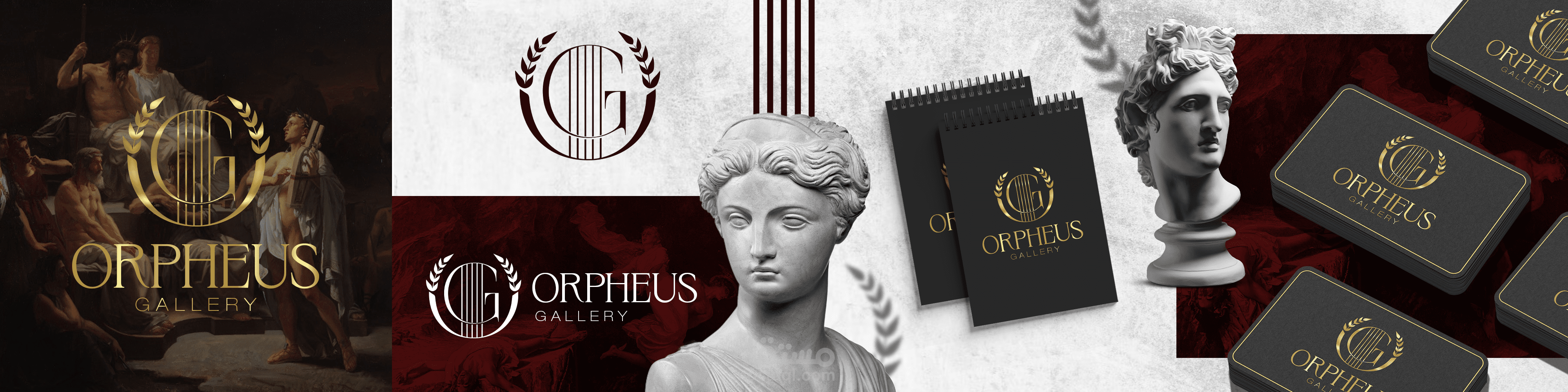 هوية معرض فني "أورفيوس غاليري ORPHEUS GALLERY" من اسم اله الشعر والموسيقى في الميثولوجيا الإغريقية. يرمز أورفيوس إلى الجمال والفن والإلهام، لذلك تسعى الهوية البصرية إلى عكس هذه القيم من خلال استخدام الألوان والأشكال والعناصر المرئية المناسبة.