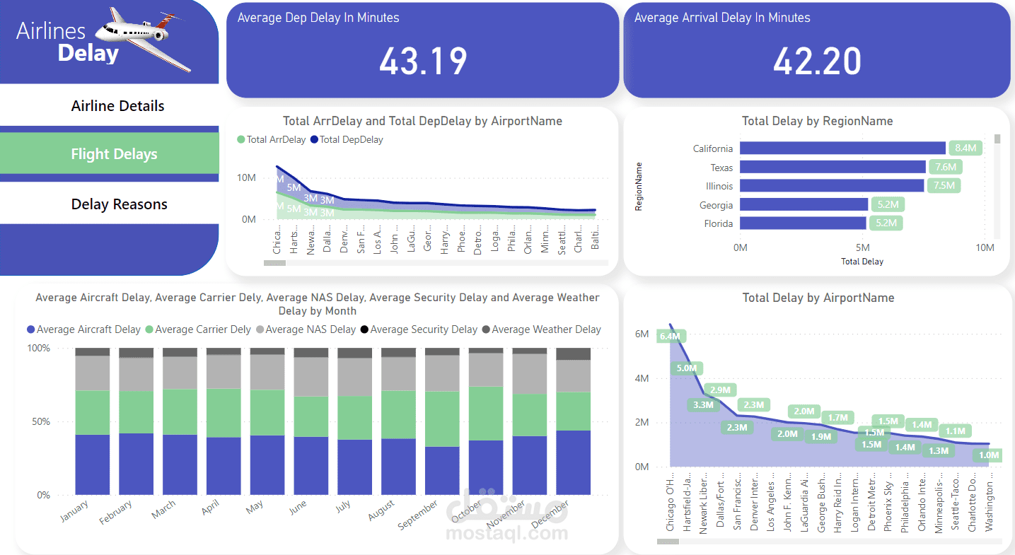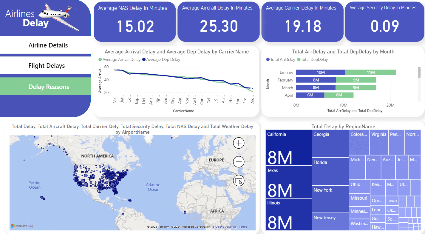 - Utilized DAX measures for dynamic calculations, unlocking deeper insights into delay causes, averages, and totals.