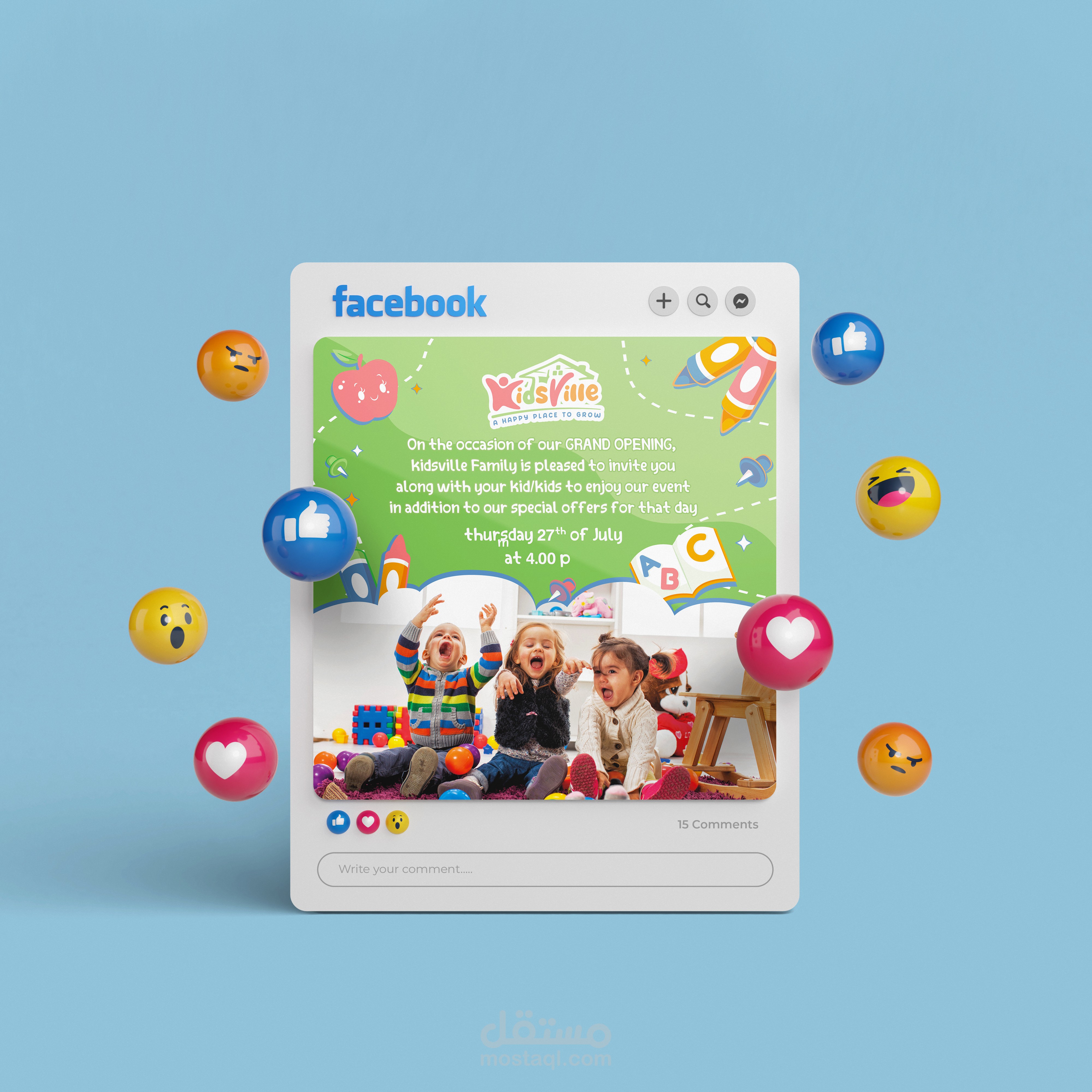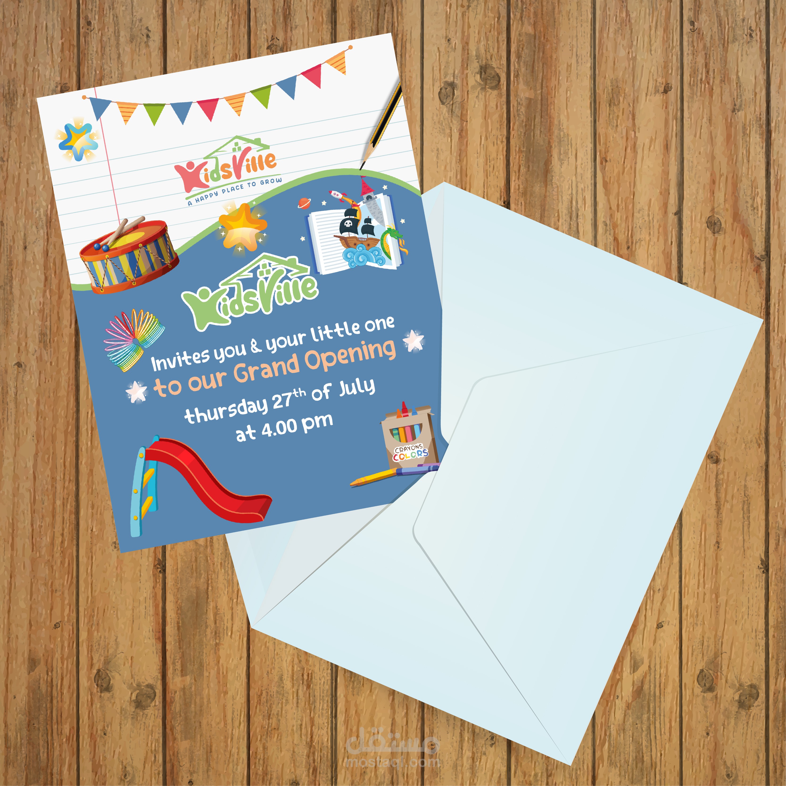 تصميم فلاير و دعوة افتتاح وتصميم سوشيال ميديا لحضانة kids ville nursery
