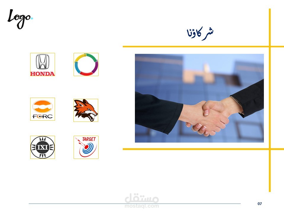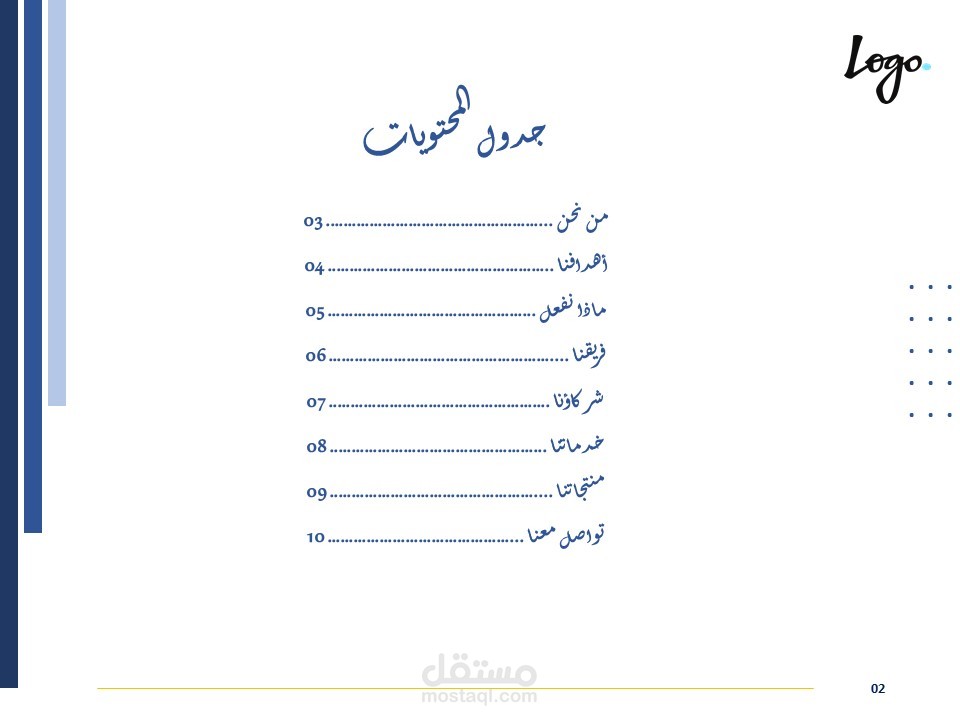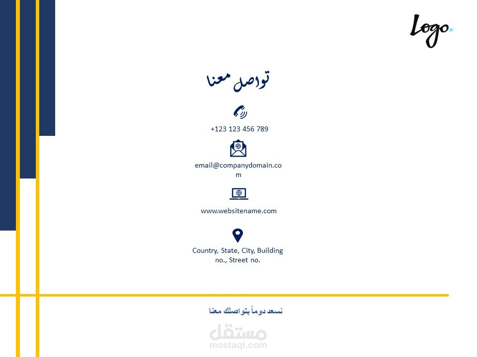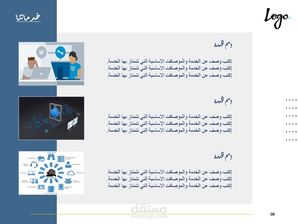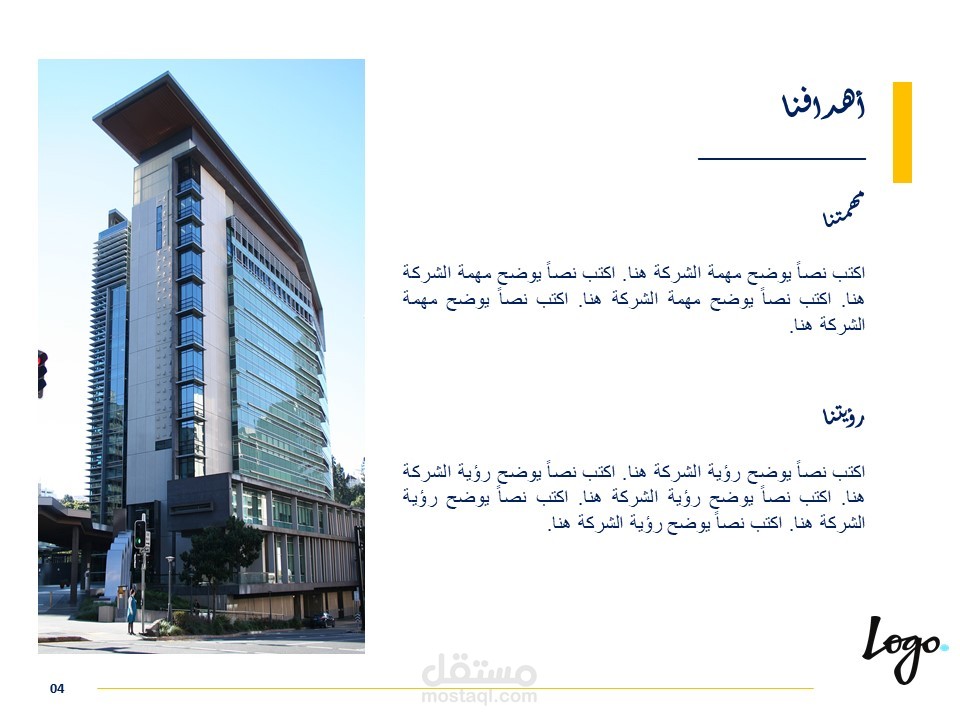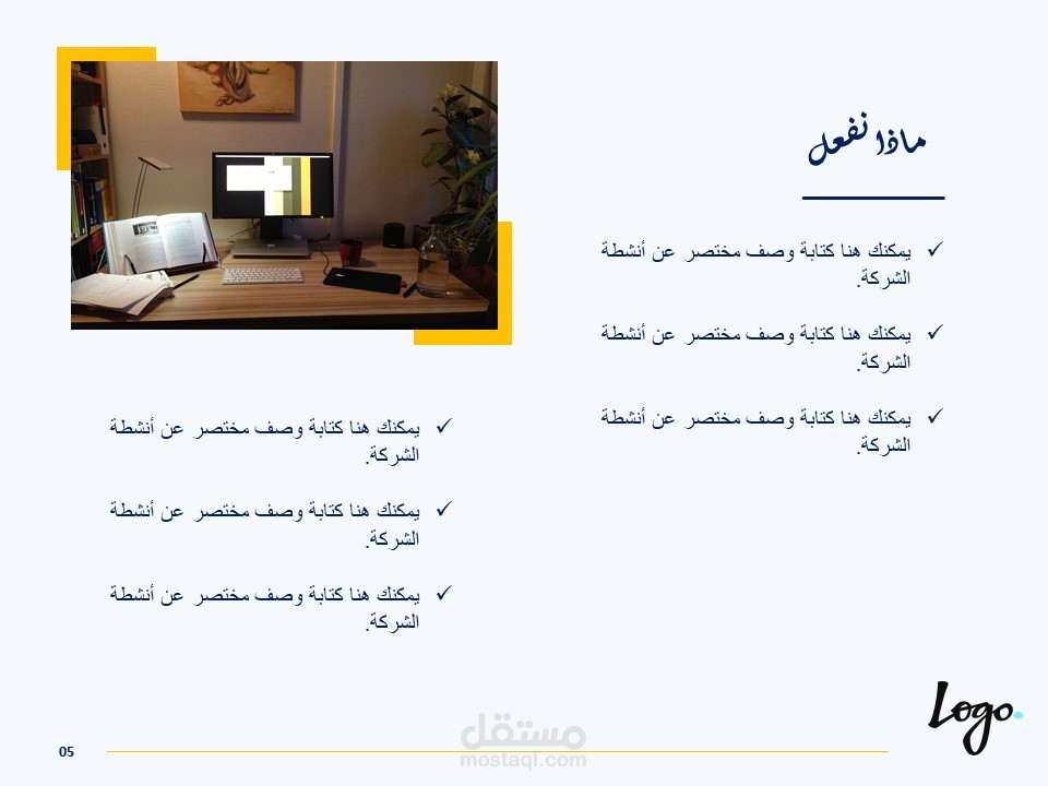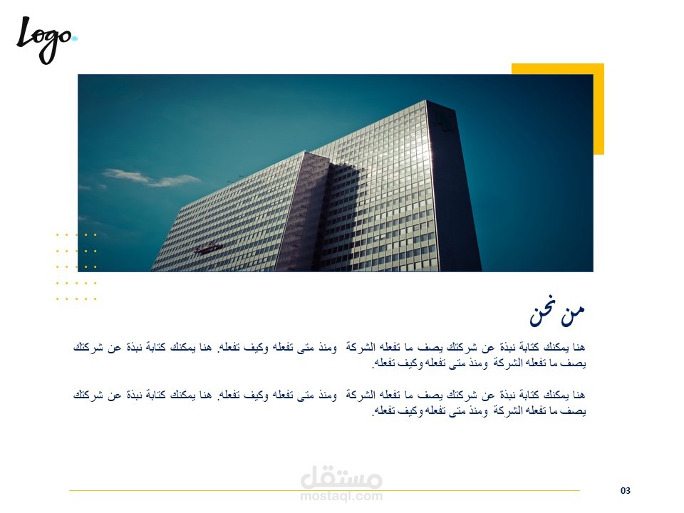 كذلك يمكن أن يُستخدم القالب لعرض تقديمي لإستعراض خدمات او منتجات تقدمها المؤسسة.