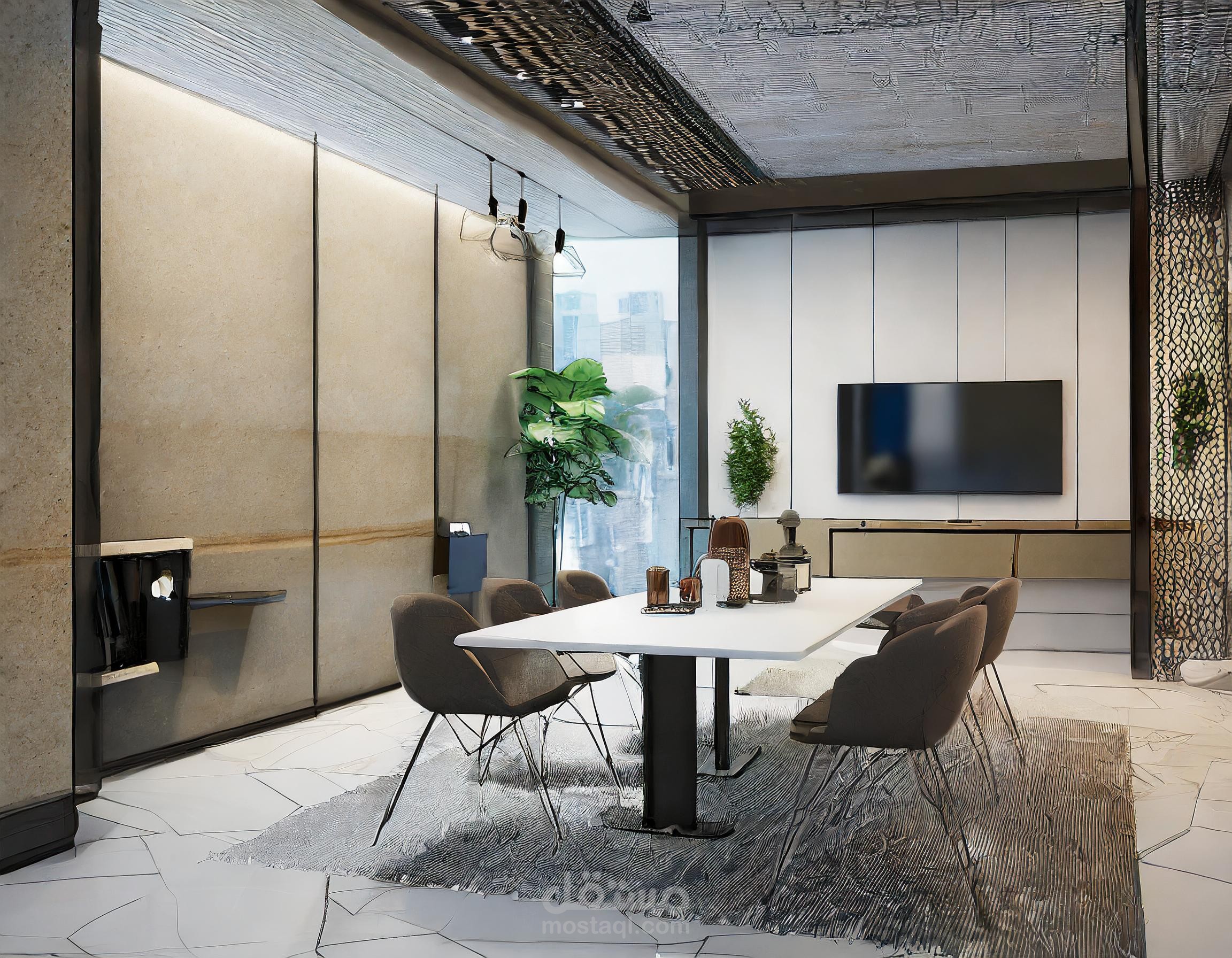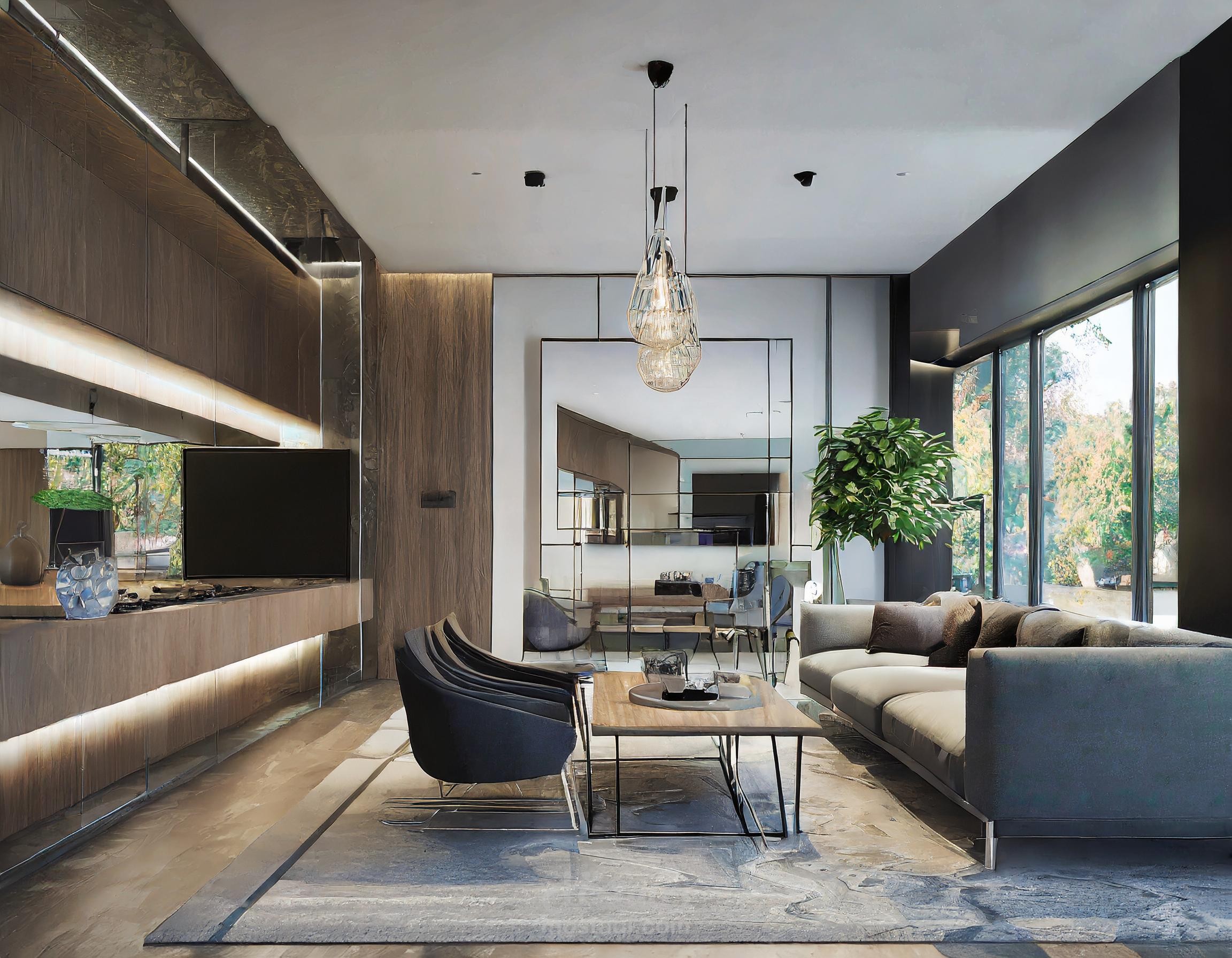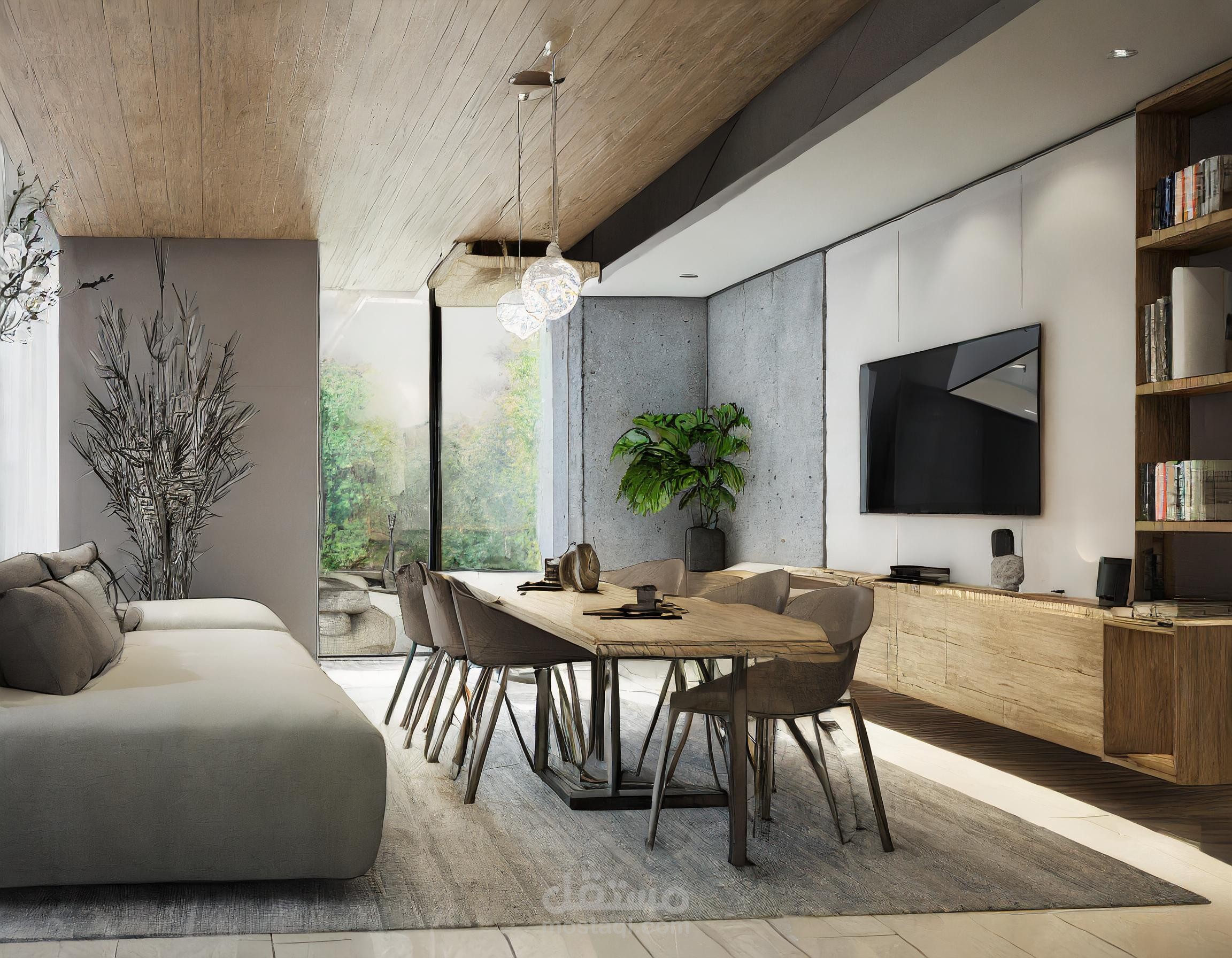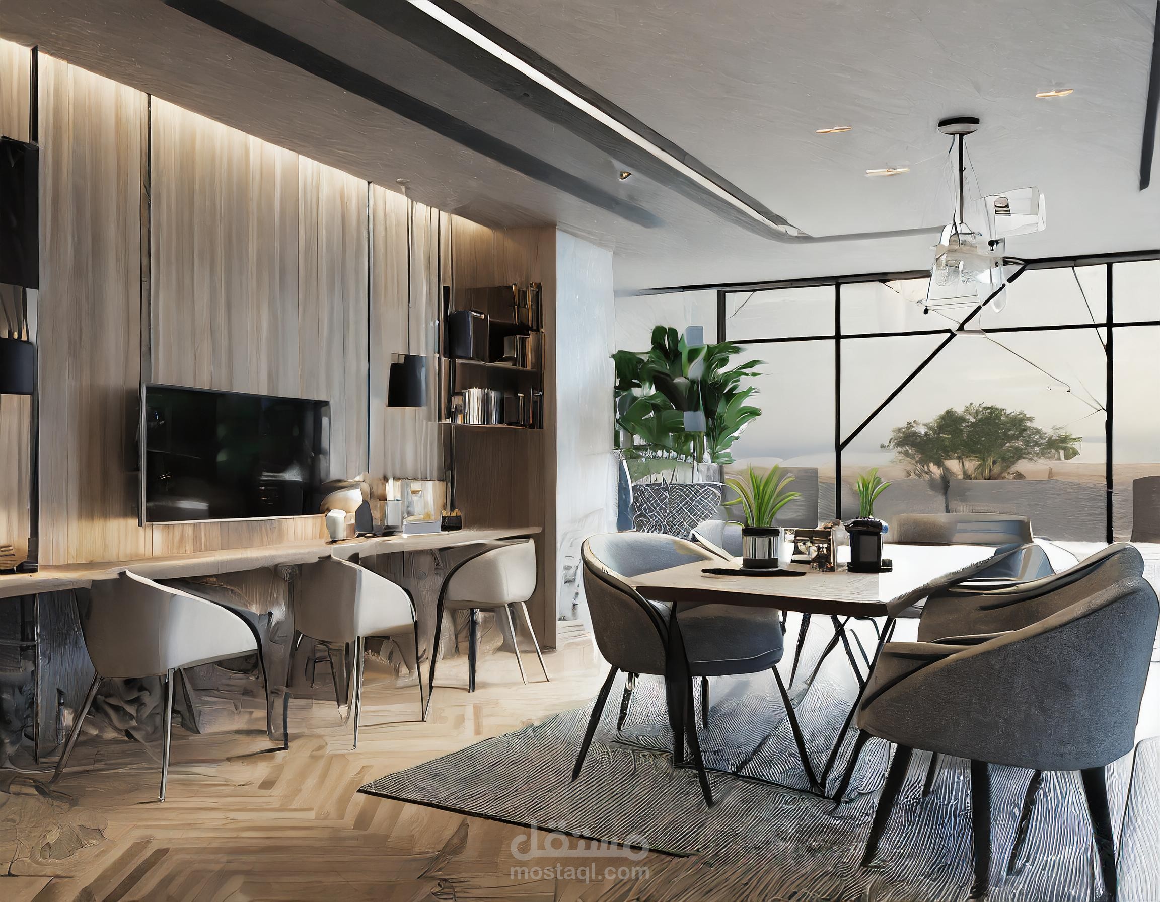 Project Title: Design of an Open Lounge with a Modern System, Coffee Corner, Dining Table, and TV Screen