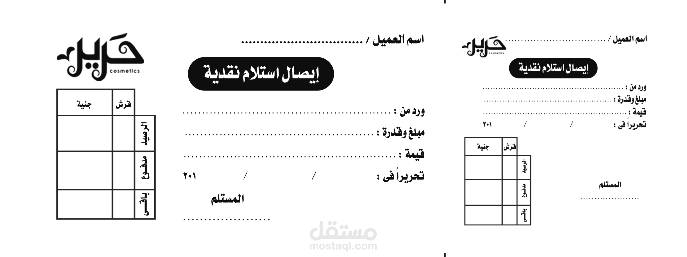 - يتم تنفيذ رسم الفاتورة او الايصال غالبا علي برنامج الكوريل درو واحيانا اليستريتور , والكتابات والتنسيق علي برنامج الفوتوشوب.