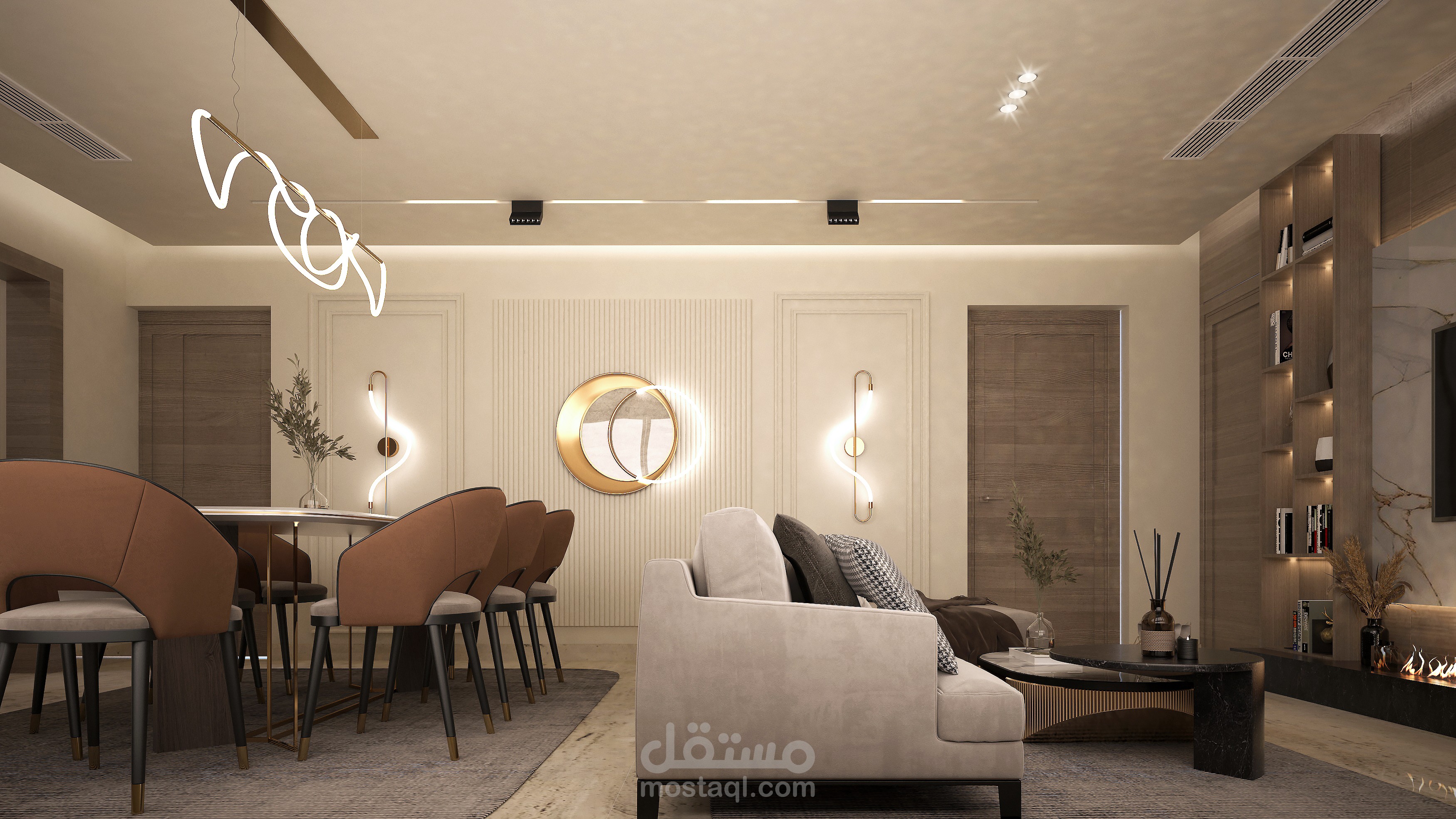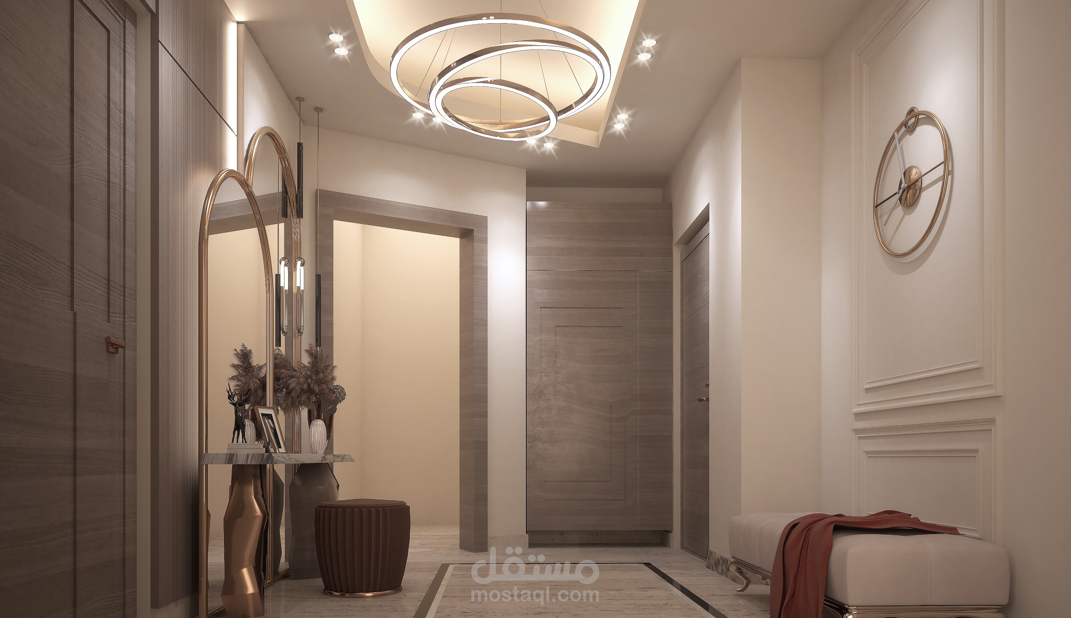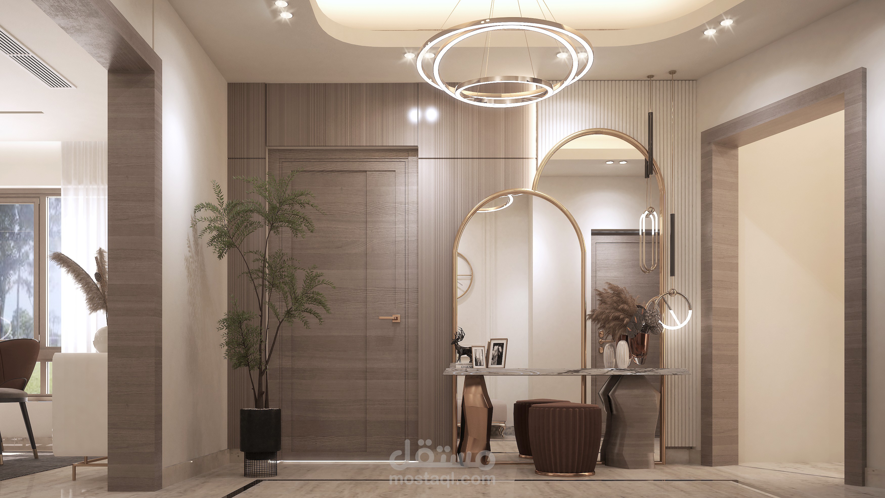 تصميم داخلي لغرفة معيشه و مدخل بالسعودية على الطراز المودرن باستخدام احدث برامج التصميم الحديثه