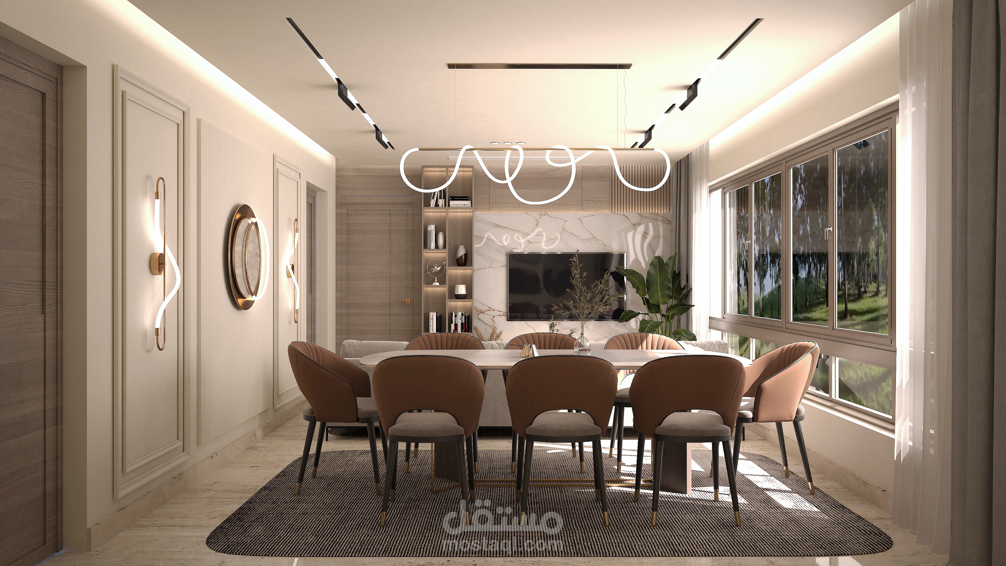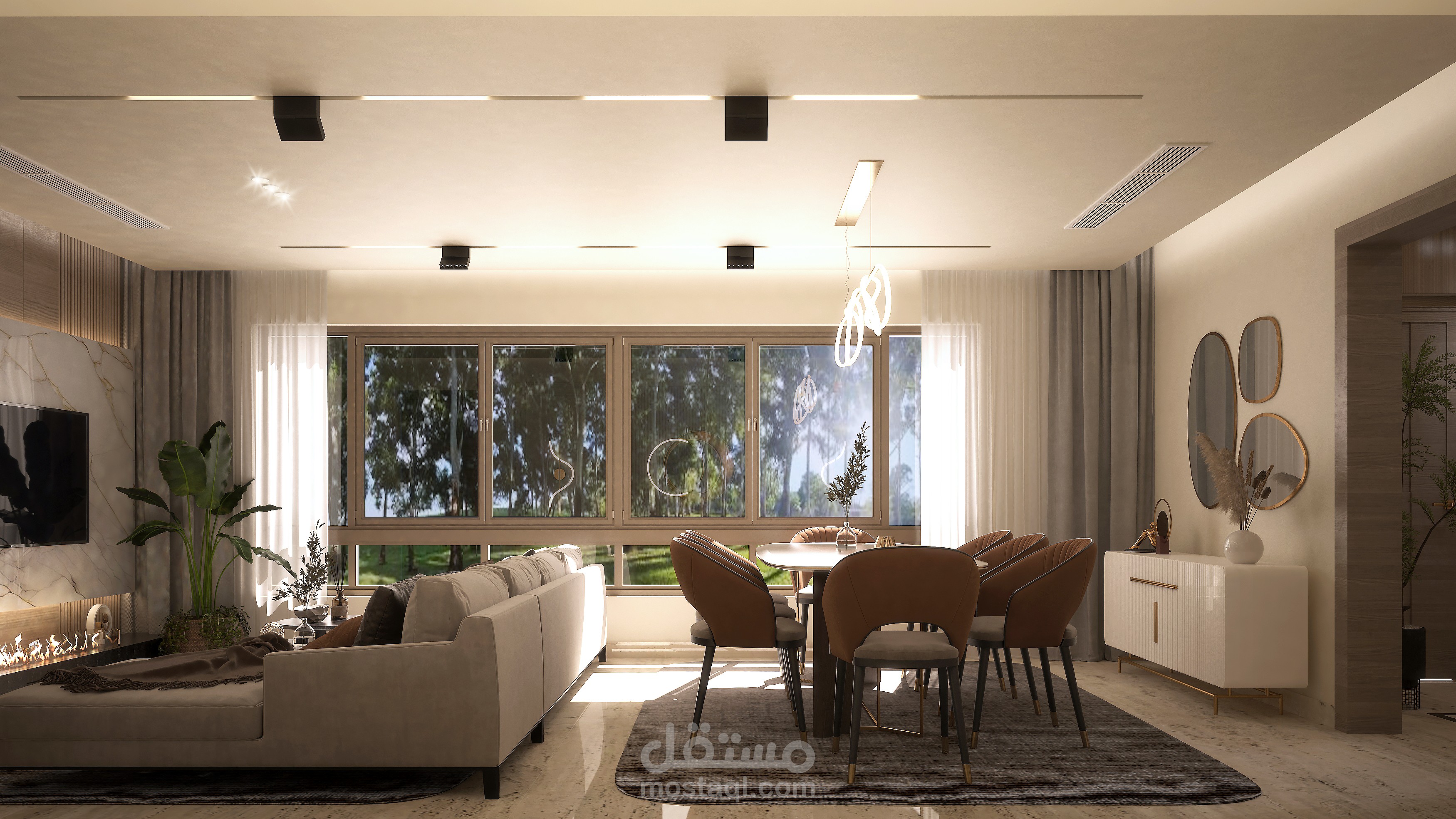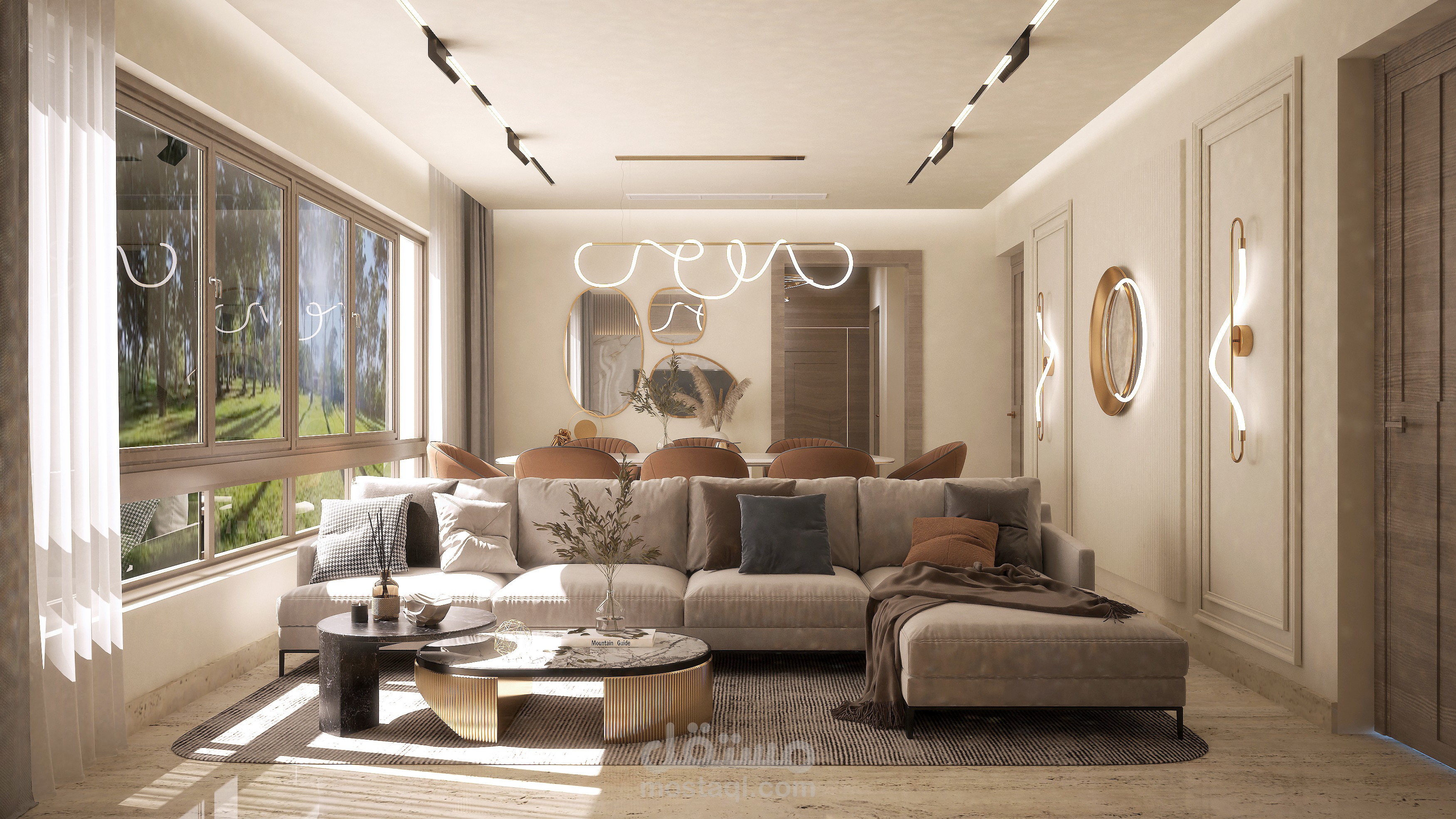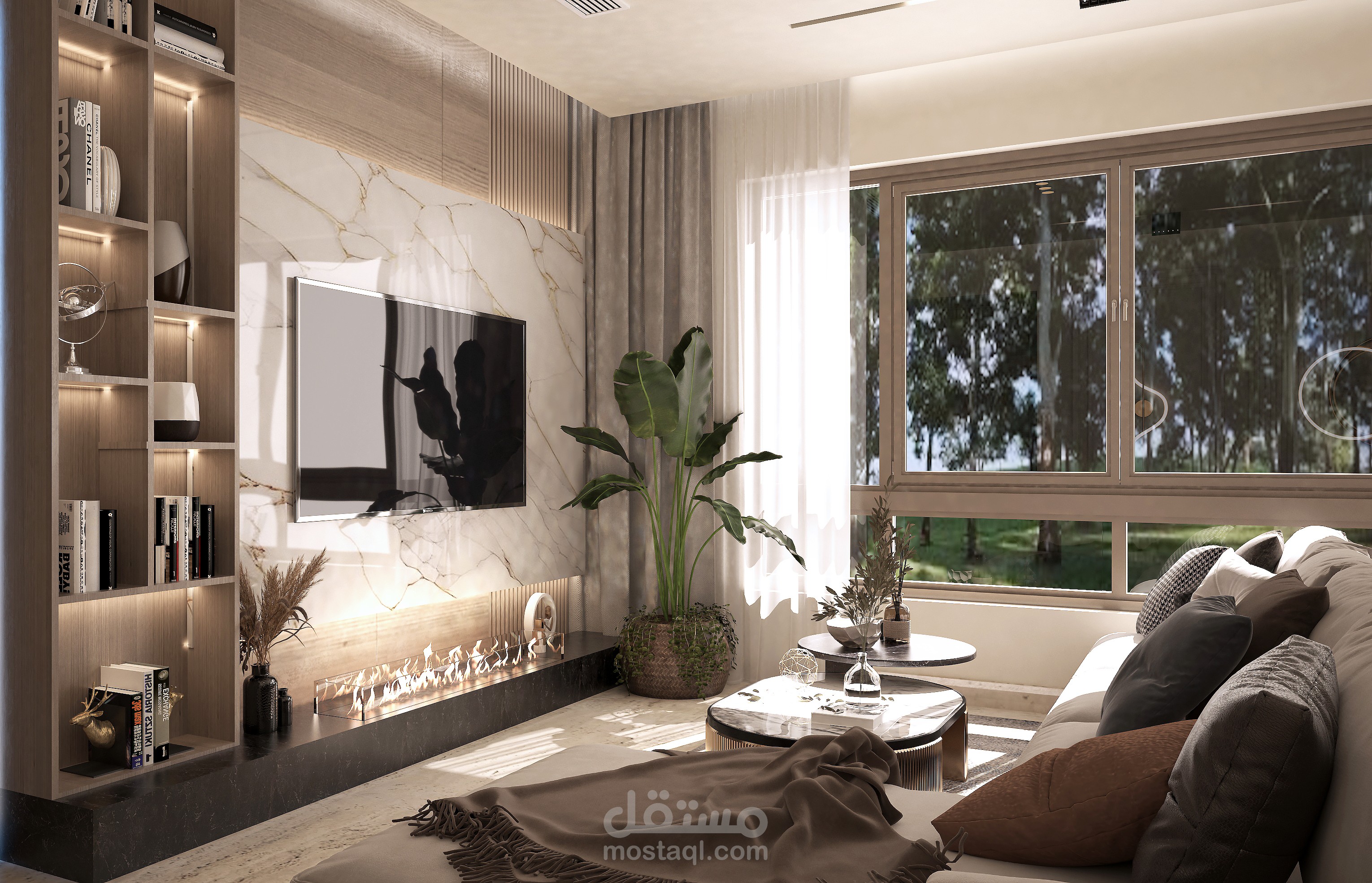 تصميم داخلي لغرفة معيشه و مدخل بالسعودية على الطراز المودرن باستخدام احدث برامج التصميم الحديثه