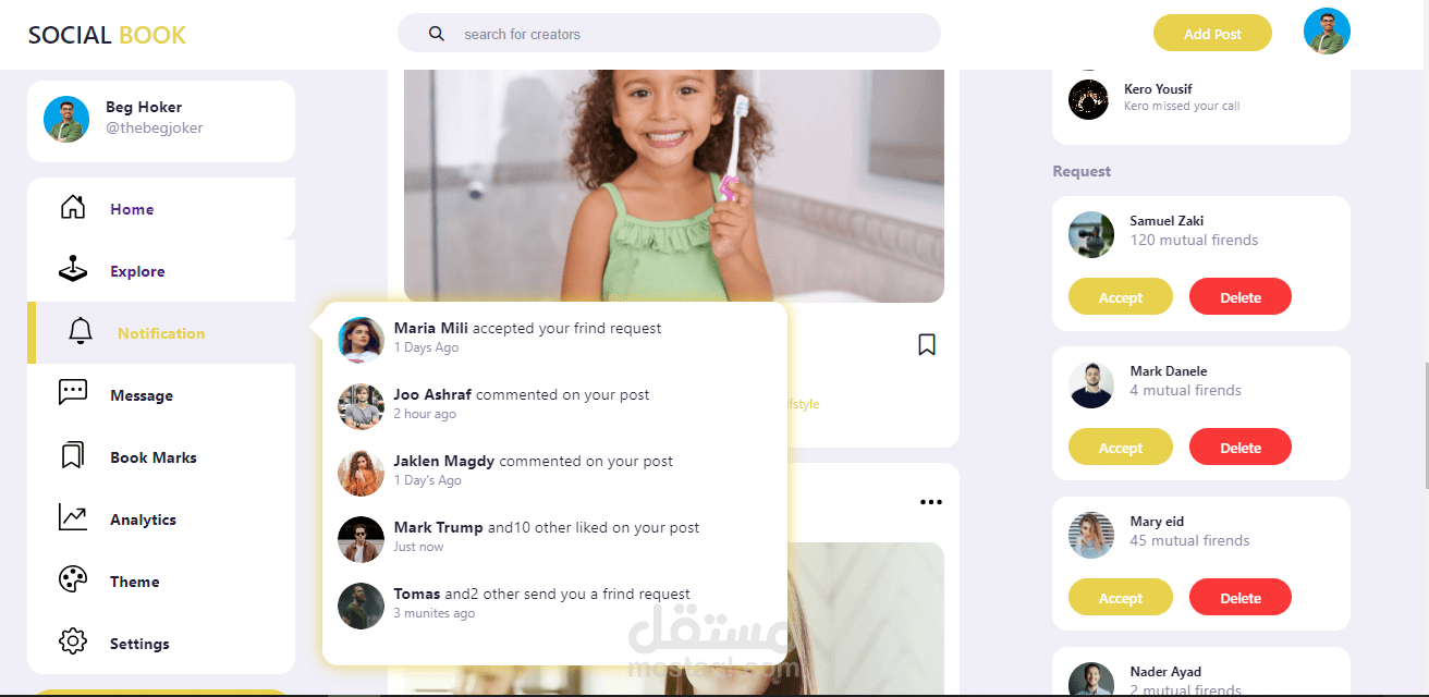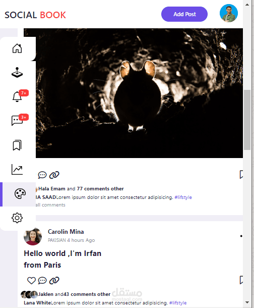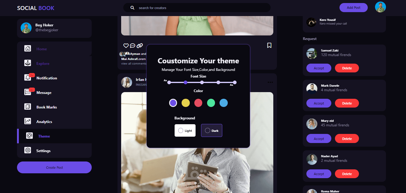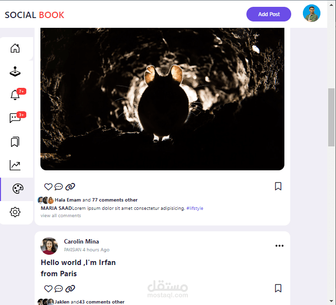 هذه الخدمه تتكون من صفحه واحده هذا التصميم يمثل صفحه سوشيال ميديا تتكون من headerو يوجد بها story للمشاهده الصور لاشخاص اخري و اضافه story خاصه بك و استخدمت فيها لغه javascript و اضافه post و يوجد بحث عن صفحات اخري و يوجد ايضا في الصفحه navbar يوجد فيها اشعارات و رسايل و ايضا نستطيع نغير الشكل و مقاس الكلام و background سواء كان اللون الابيض او الاسو وحذف طلبات الصداقه او اقبالها ةو استخدمت css لتنسيق الصفحه من حيث لون و الهوامش و تحقق فيه الاستجابات السريعه (responsive) تستجيب لاحجم الشاشه المختلف و تستطيع ان تحتفظ ب post و تكتب كومنتات و تضغط علي اعجبني