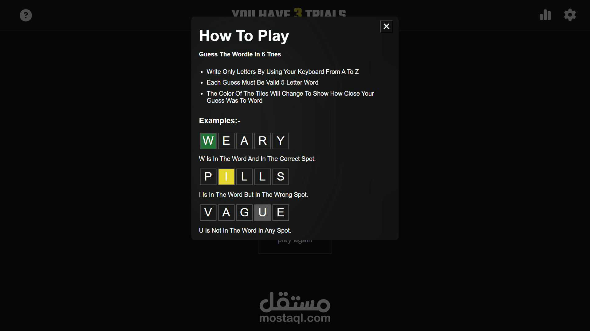 هدف اللعبة هو محاولة تخمين الكلمة العشوائية التي تتكون من 5 احرف خلال 6 محاولات