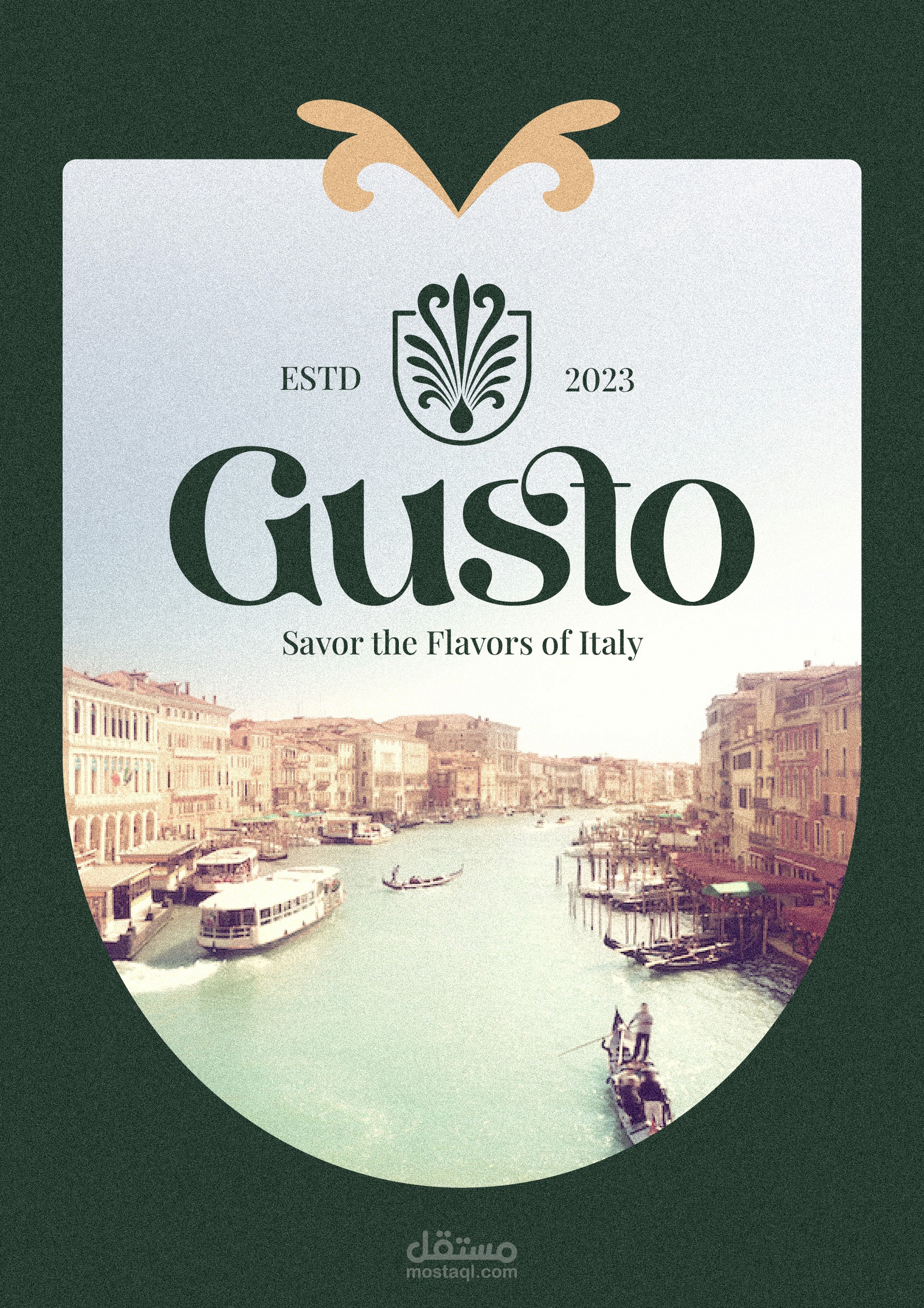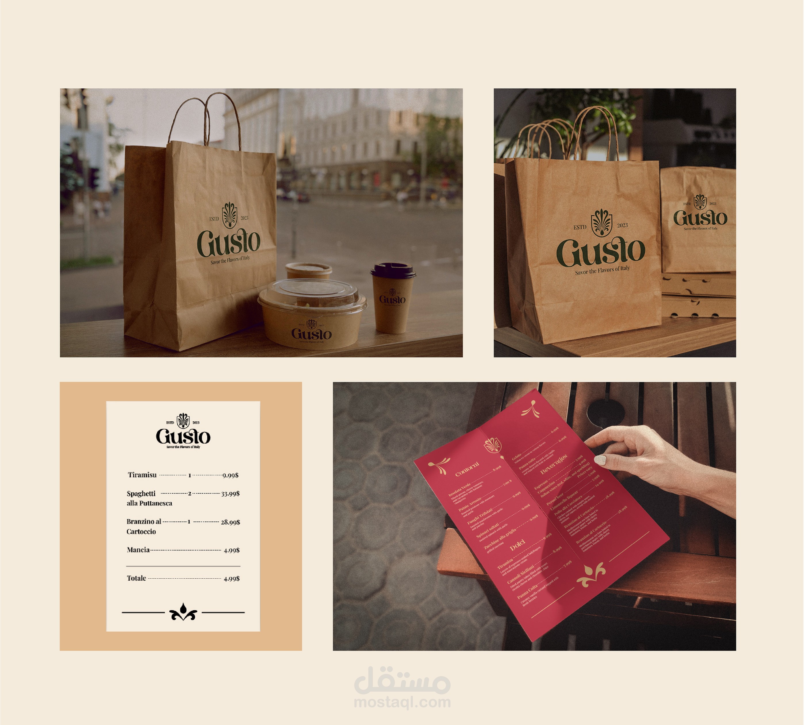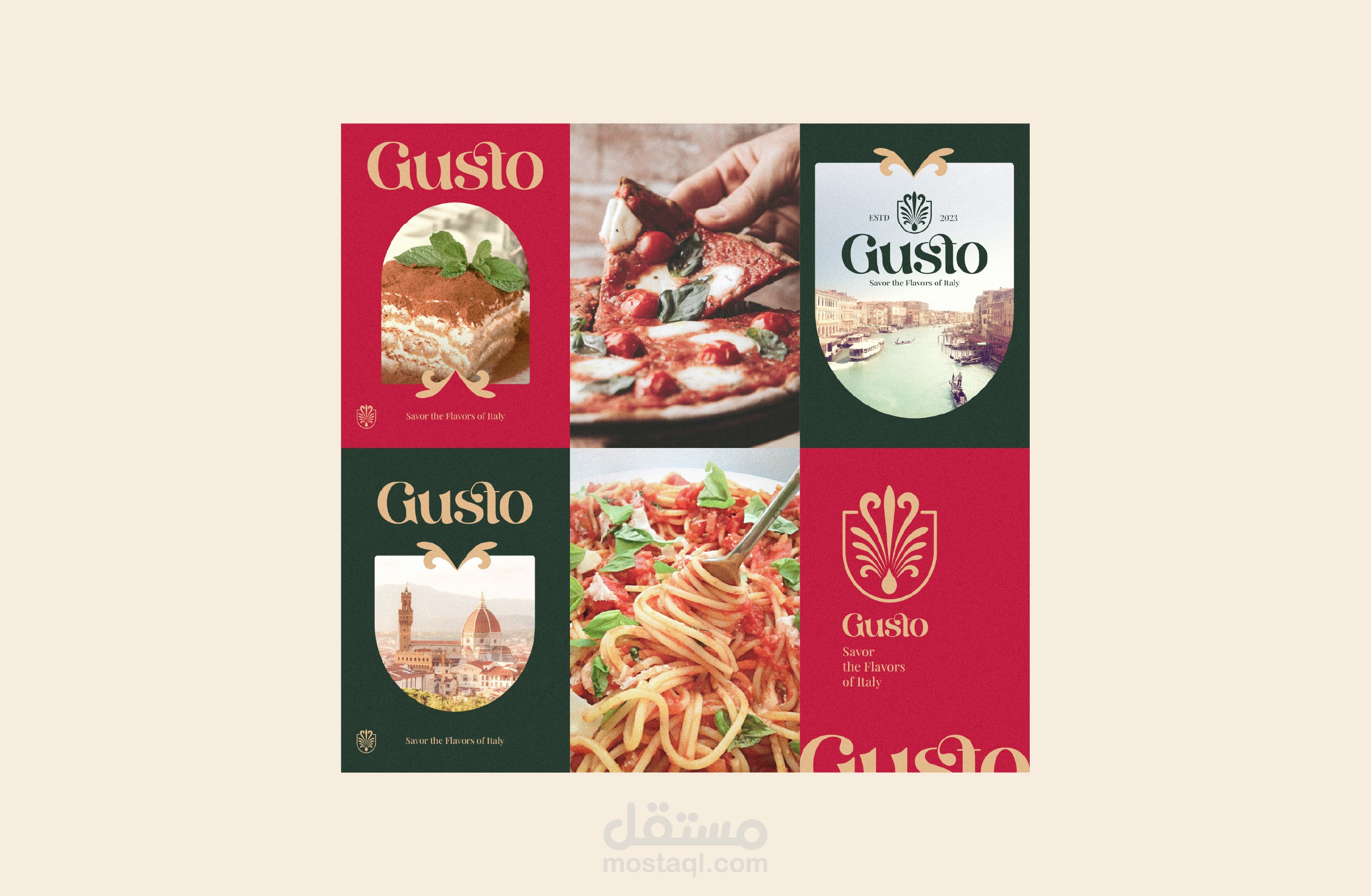 Introducing Gusto, an authentic Italian restaurant with a warm and inviting atmosphere that transports you to a nostalgic dining experience. Our challenge was to create a brand identity that captures the essence of the restaurant's tradition and authenticity while appealing to a modern audience. After thorough research and brainstorming, we developed a logo concept based on olive leaves and fresh vegetable vines merged with a drop of olive oil as it is one of the main ingredients in Italian cuisine besides the fresh vegetables, conveying both authenticity and freshness. The ornamental logo features five leaves on both sides, representing the five meal structures of the Italian tradition as a hidden concept. The serif logotype adds to the vine-inspired design. Experience Gusto's warmth and authenticity, where every dish is crafted with the freshest ingredients and a passion for Italian tradition.