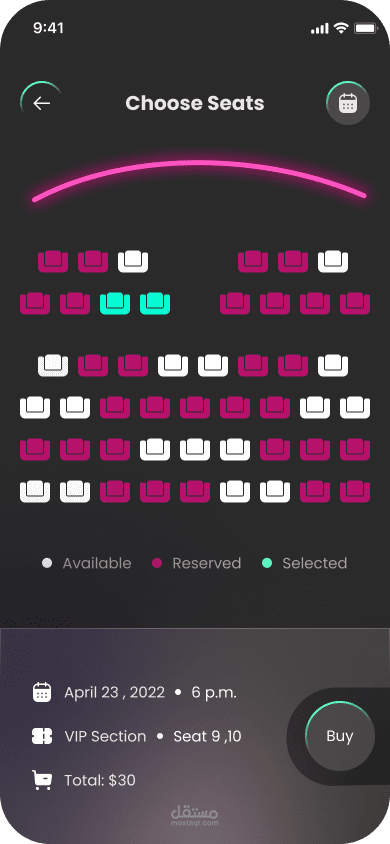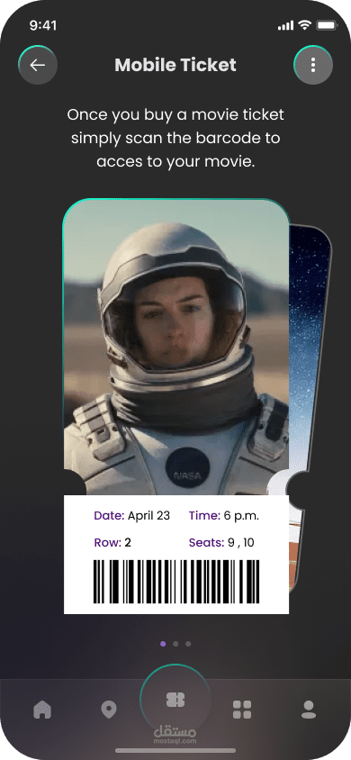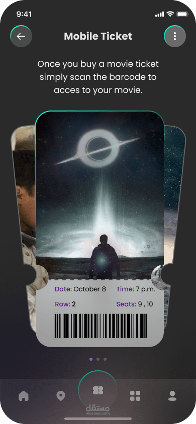 تصميم واجهات تجربة المستخدم لتطبيق قطع تذاكر سينما، مع كتابة المحتوى الخاص فيها، عن طريق تطبيق Figma