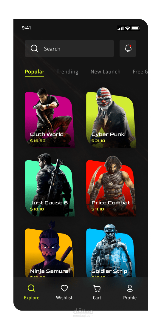 تصميم واجهات تجربة المستخدم لتطبيق شراء ألعاب، مع كتابة المحتوى الخاص فيها، عن طريق تطبيق Figma