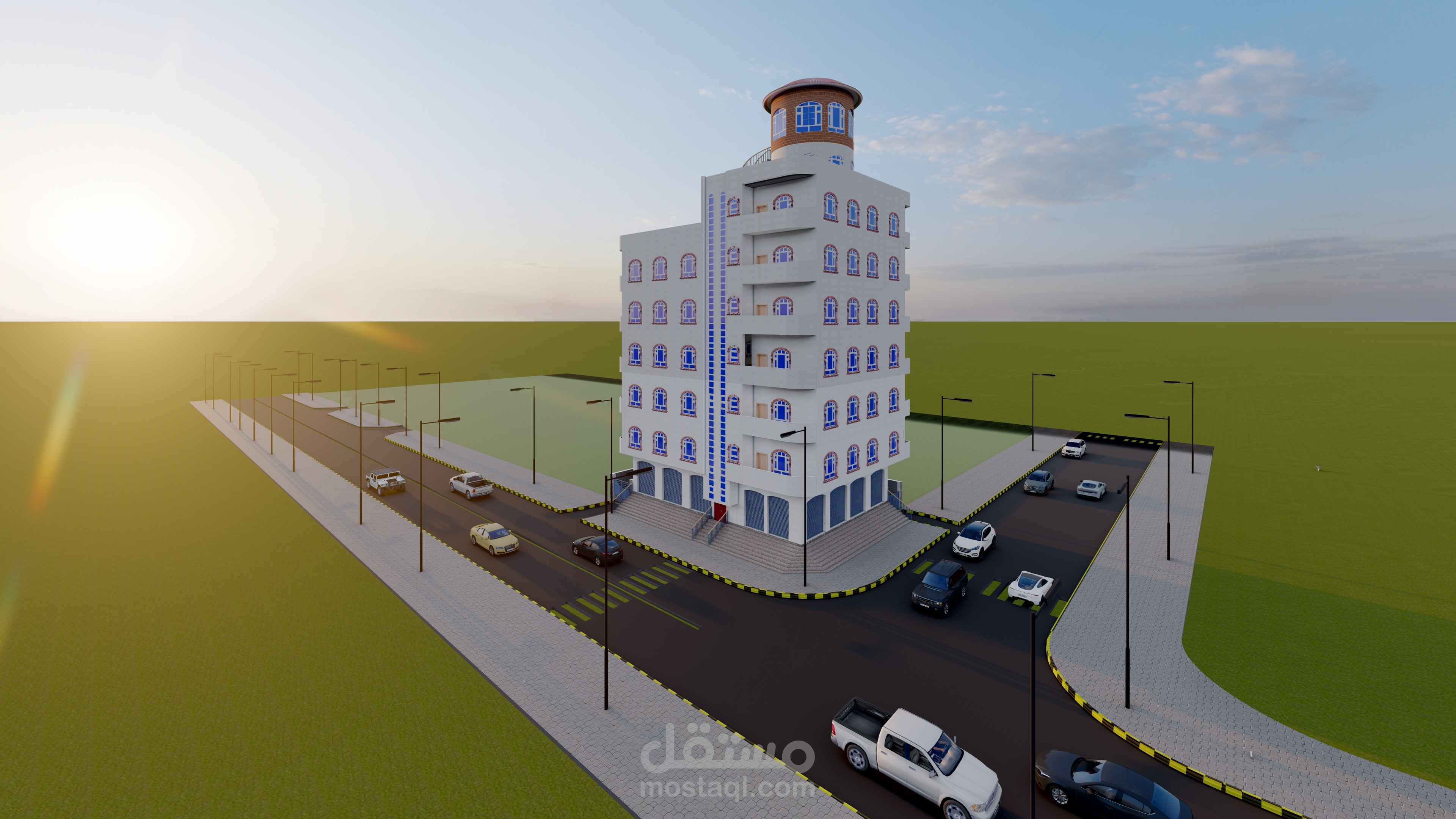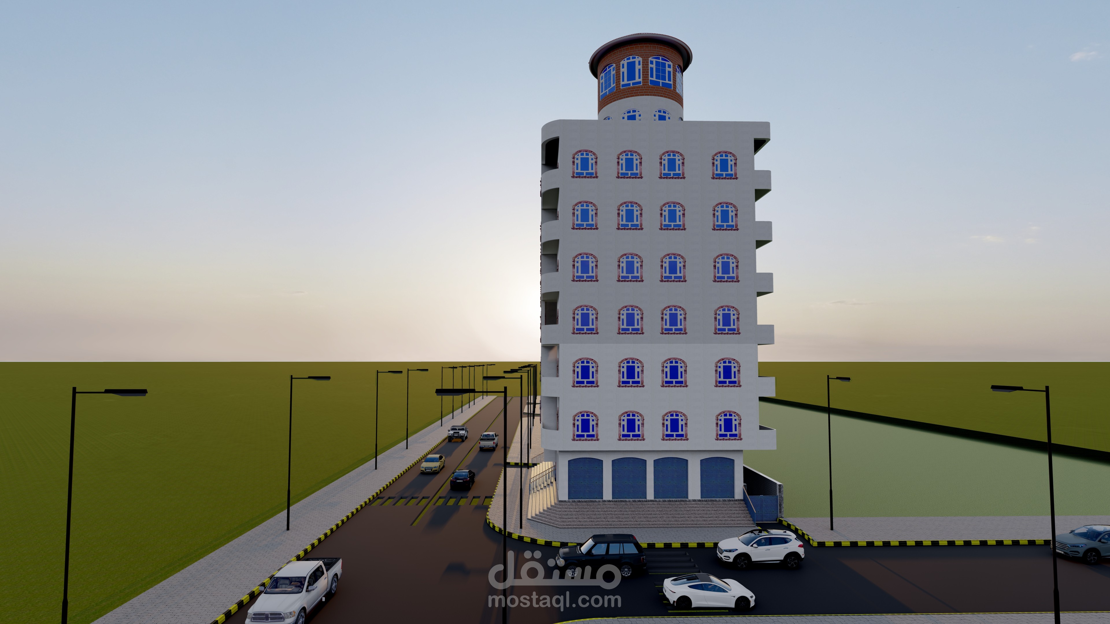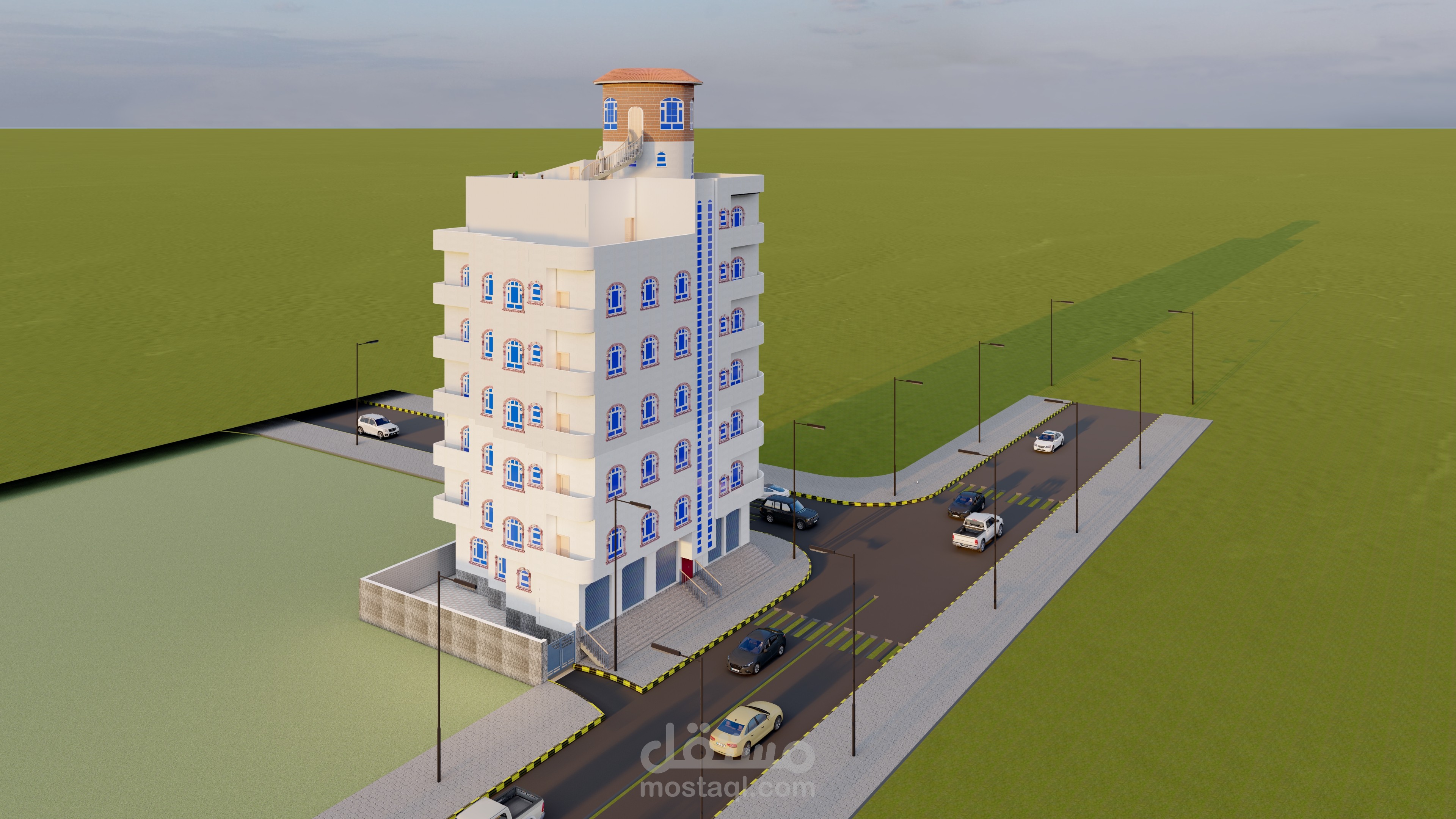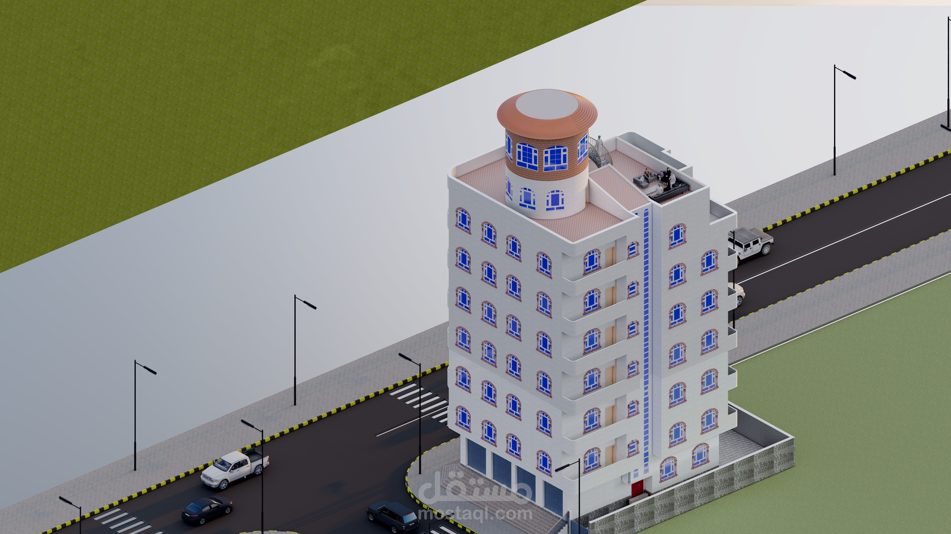 تصميم مجسم عماره خمسه ادور مع ملحق وطرمانه بشكل دائري حسب الذوق اليمني