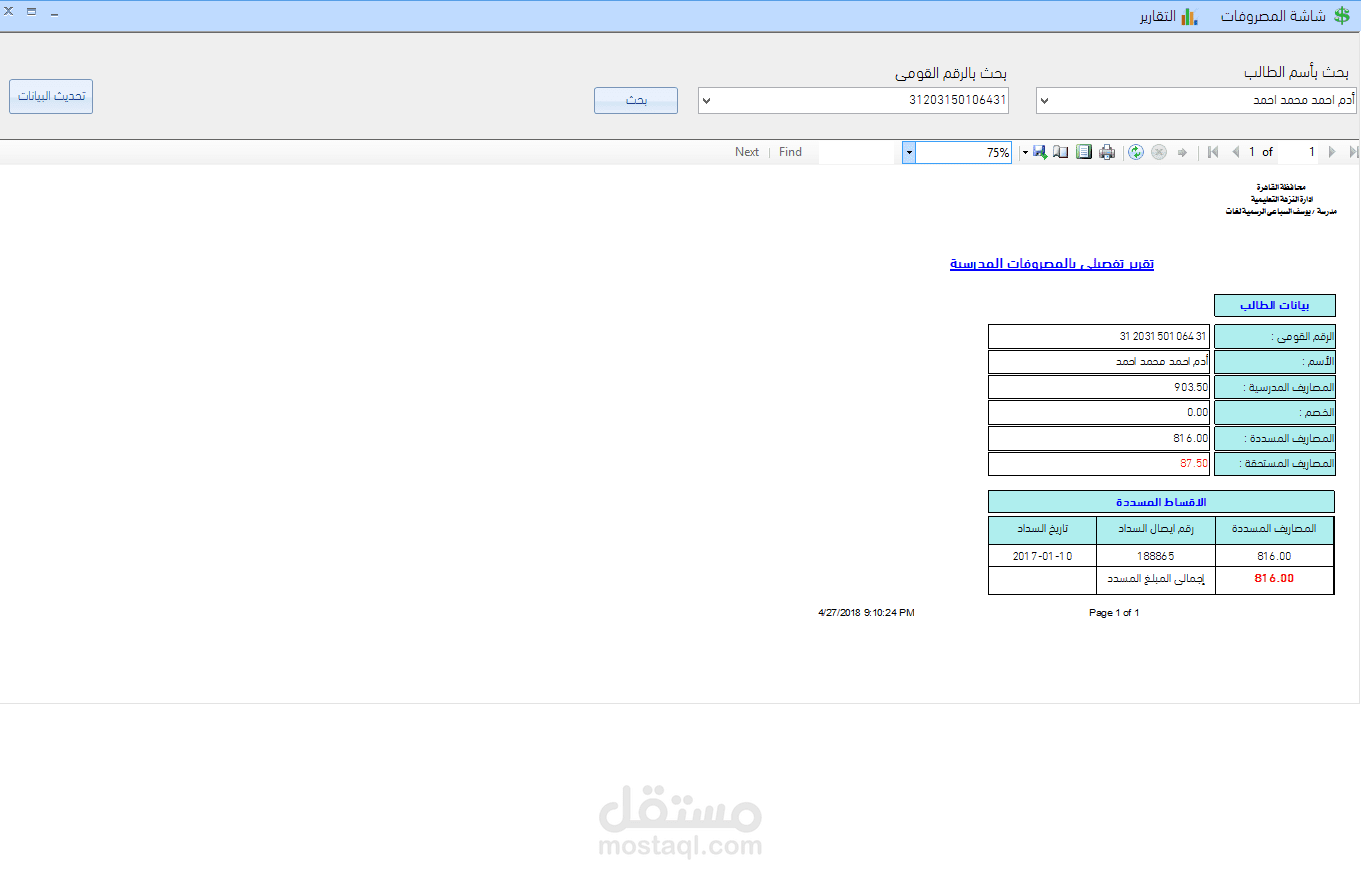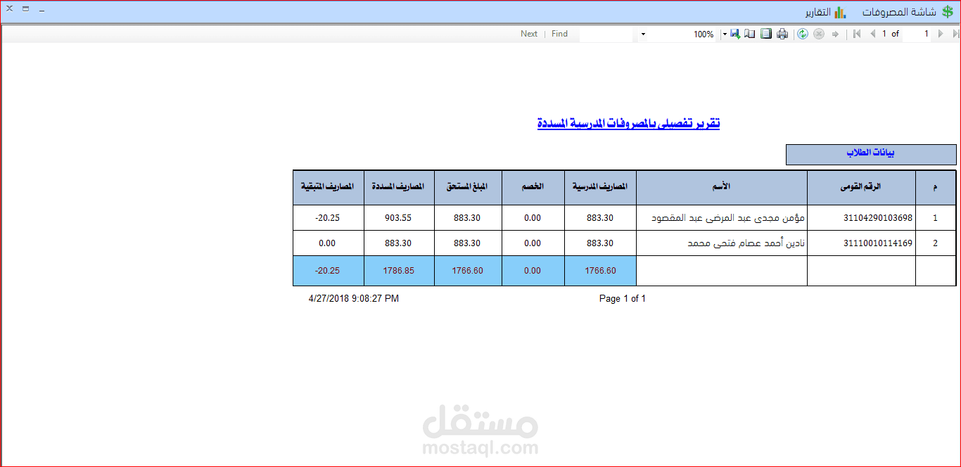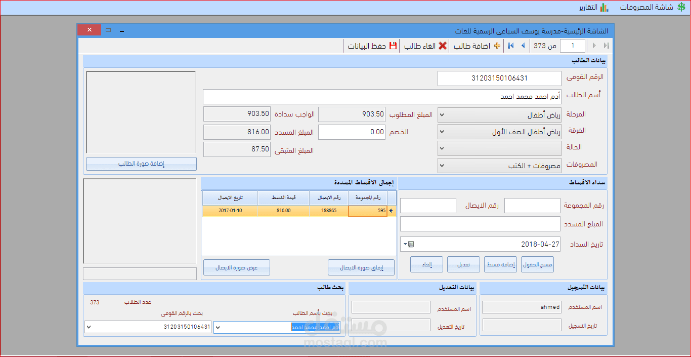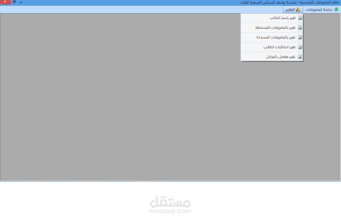 يعمل البرنامج على تسجيل المصروفات المدرسية مقسمة الى المراحل الأربع على حدى مع مجموعة من التقارير لكل مرحلة وتقارير عامة للمدرسة