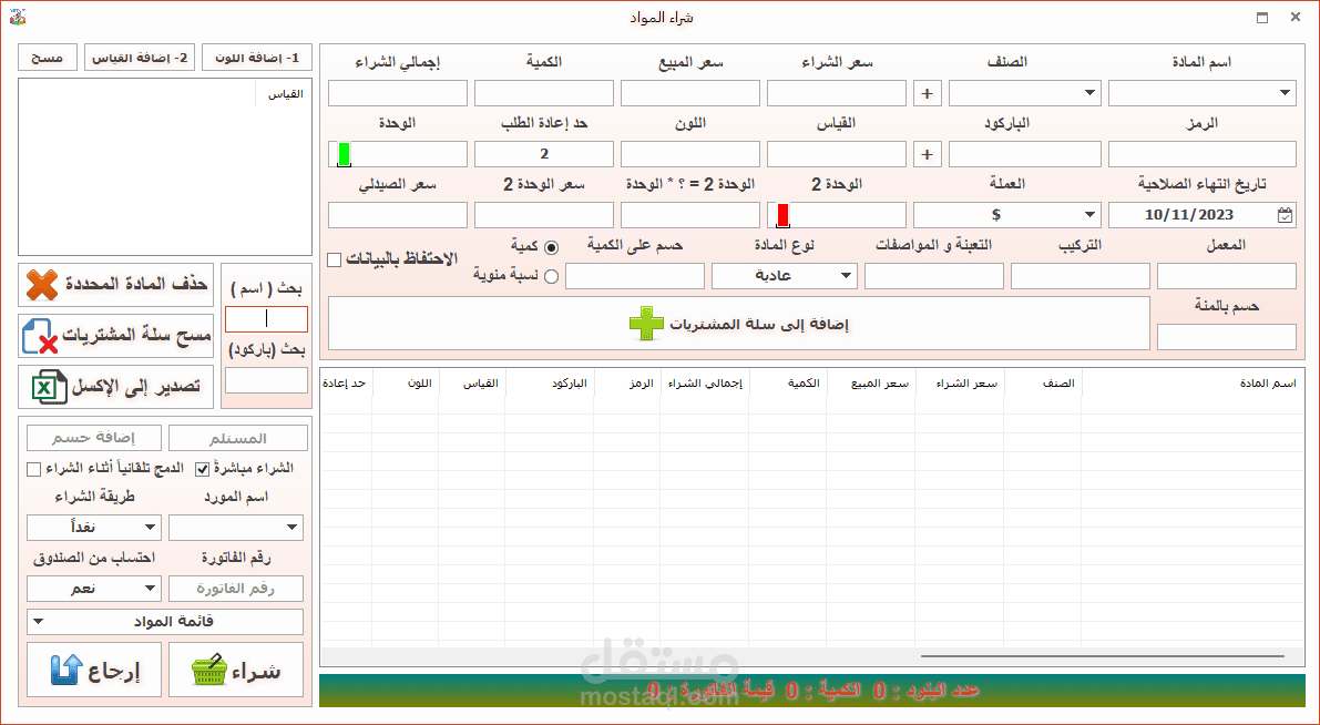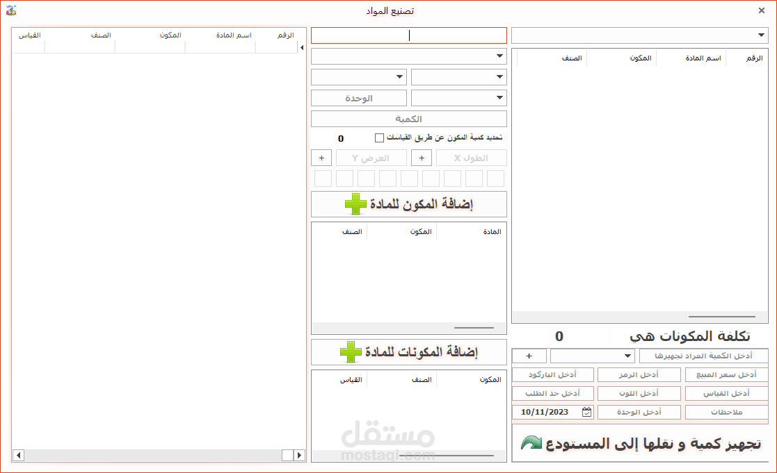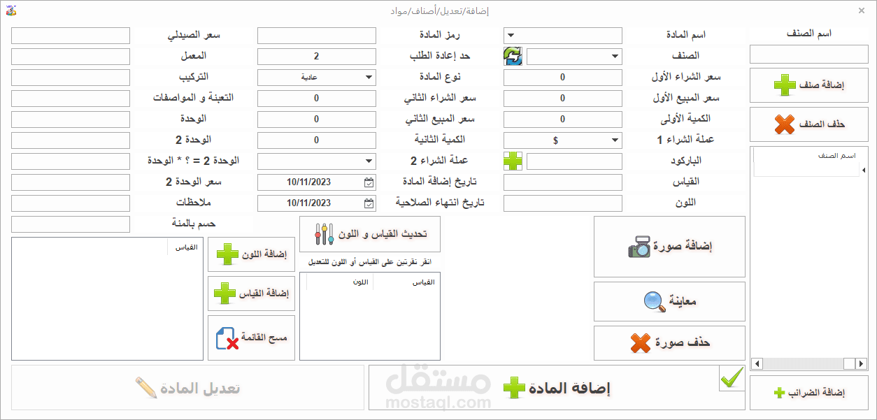 2- قائمة المواد الرئيسية و قسم إضافة مستودعات لا نهائية و التنقل بينها بأريحية تامة