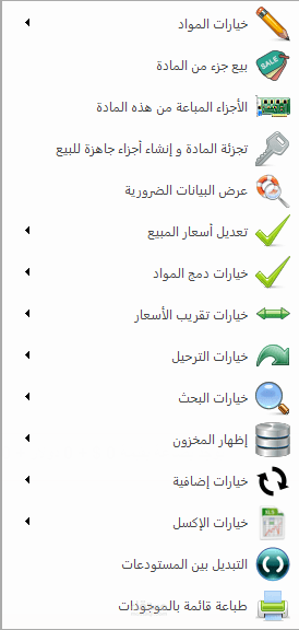 14- إمكانية تعديل أسعاء المبيع ( زيادة أو نقصان ) برقم معين أو نسبة مئوية أو حسب سعر الصرف ل ( كل المواد . مواد صنف معين . المواد المحددة . مواد صنف معين مع مراعاة التصنيف الثالث للمادة )