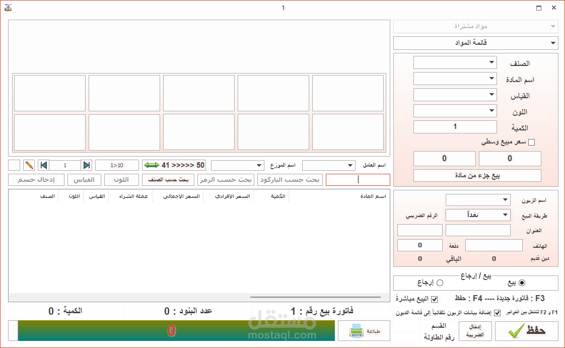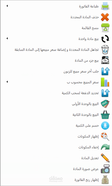 1- إمكانية البيع بطرق عديدة حسب الاسم الباركود الرموز الأزرار و الأصناف ( يمكن إضافة 500 باركود لنفس المادة )