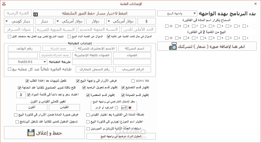 16- إعدادات تخص طريقة طباعة الفواتير . اختيار حجم ورق الطباعة و تصميم الفاتورة ( يوجد مجموعة نماذج للطباعة و بكافة قياسات أوراق الطباعة )