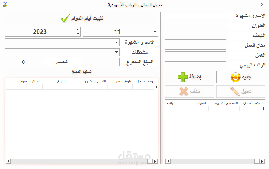 7- إضافة قسم خاص برواتب الموظفين اليومية ( تحديد أيام العمل في نهاية الشهر و الراتب اليومي و احتساب البراتب بعد خصم السلف )