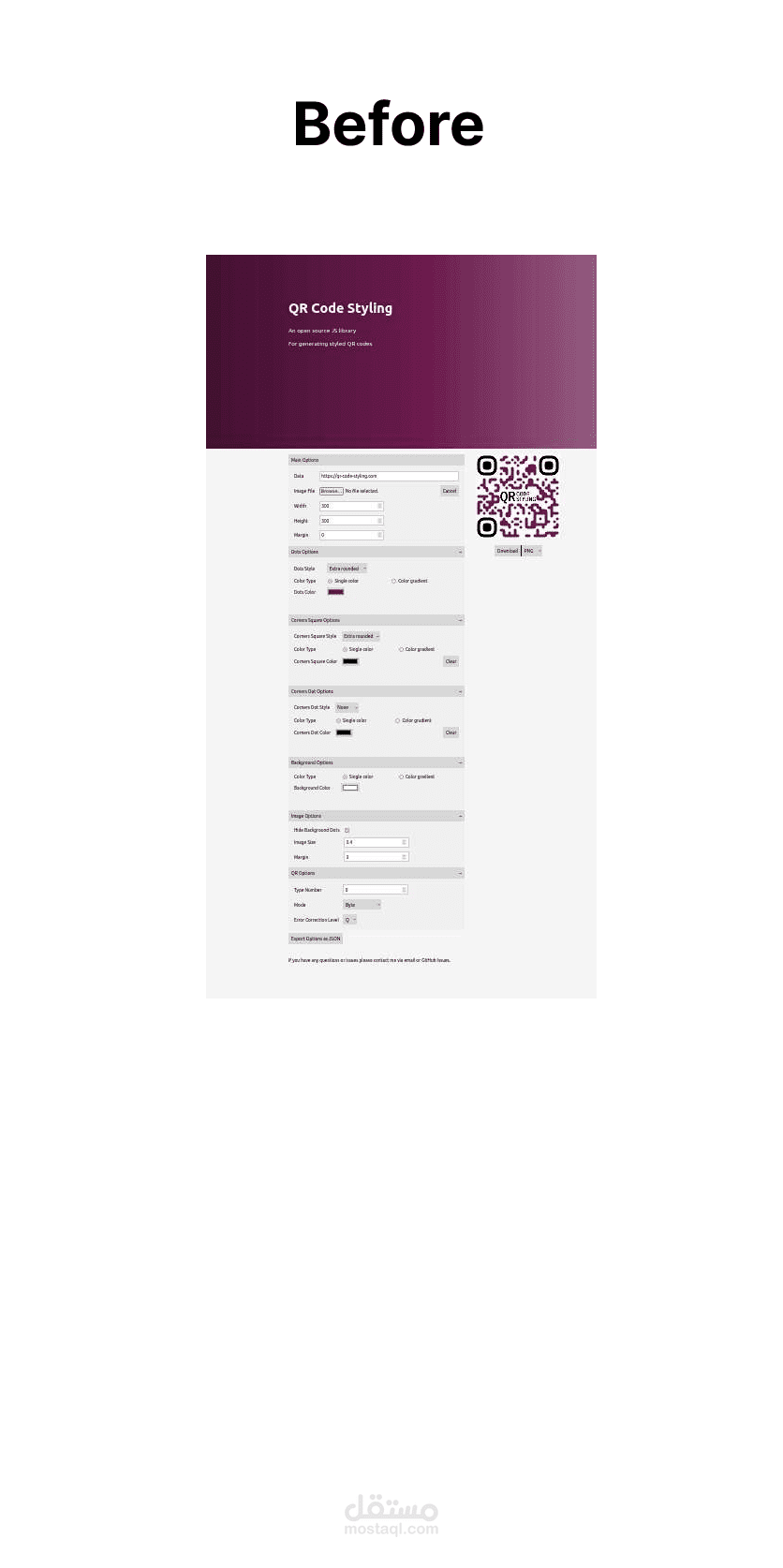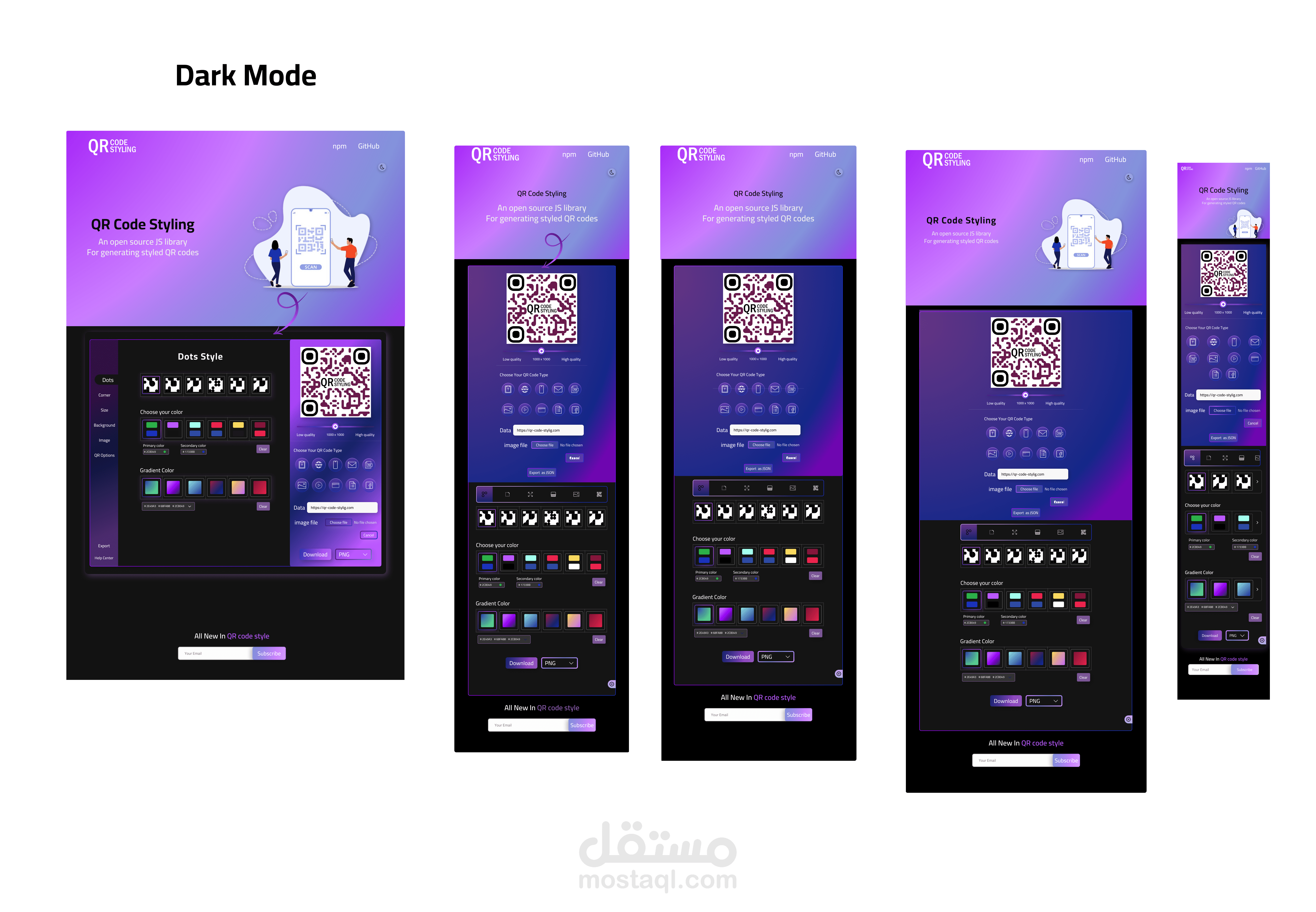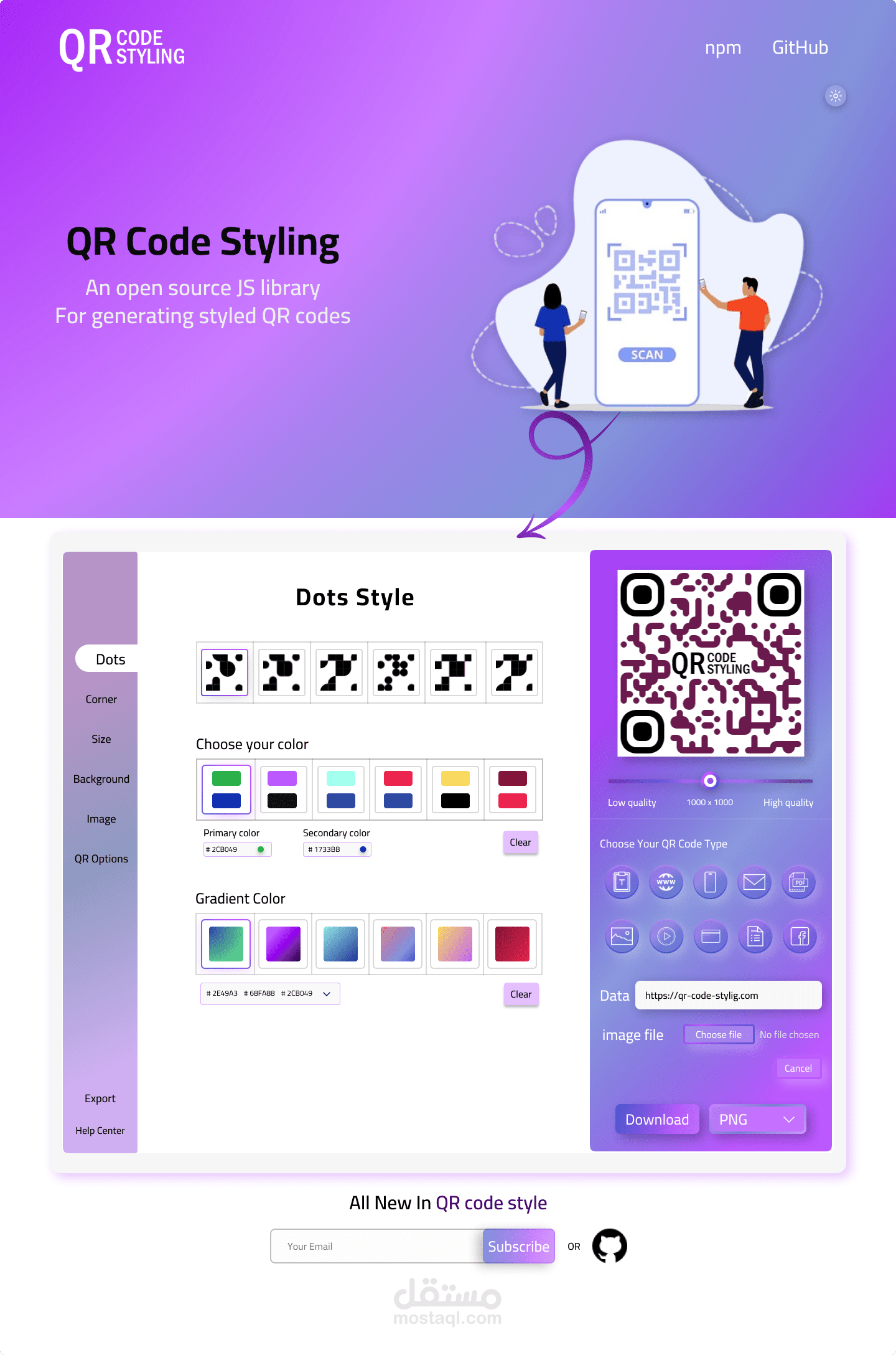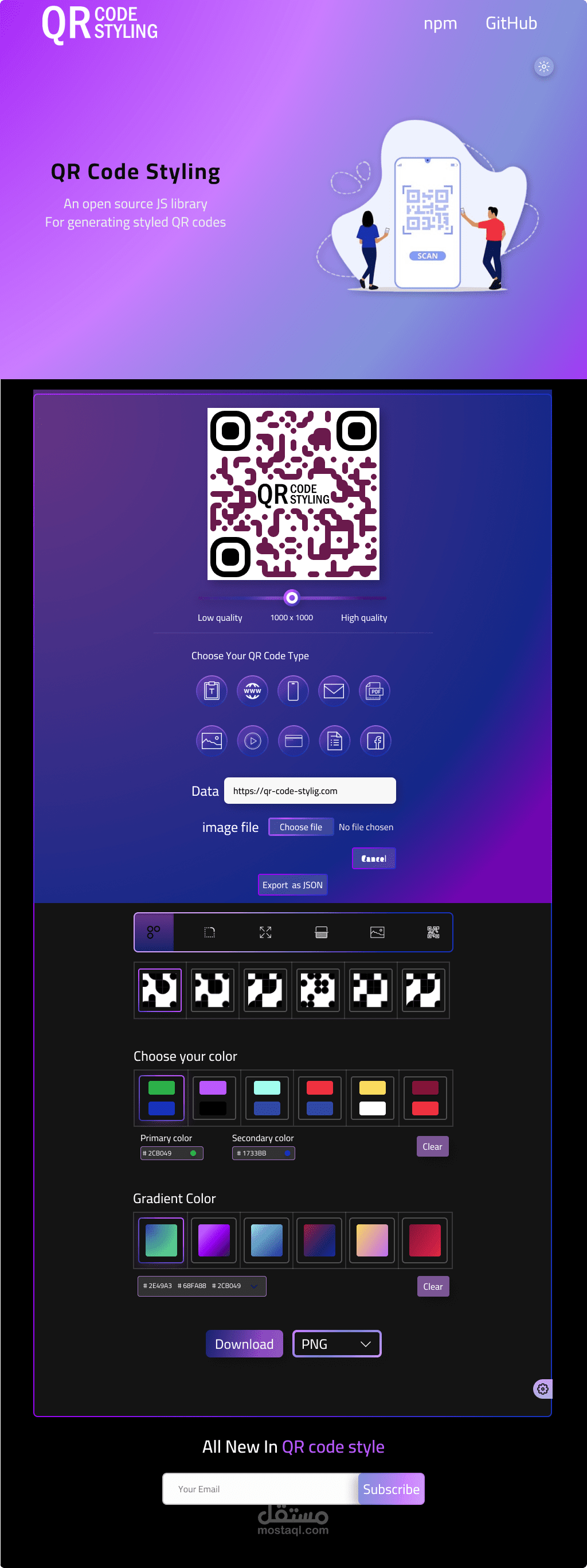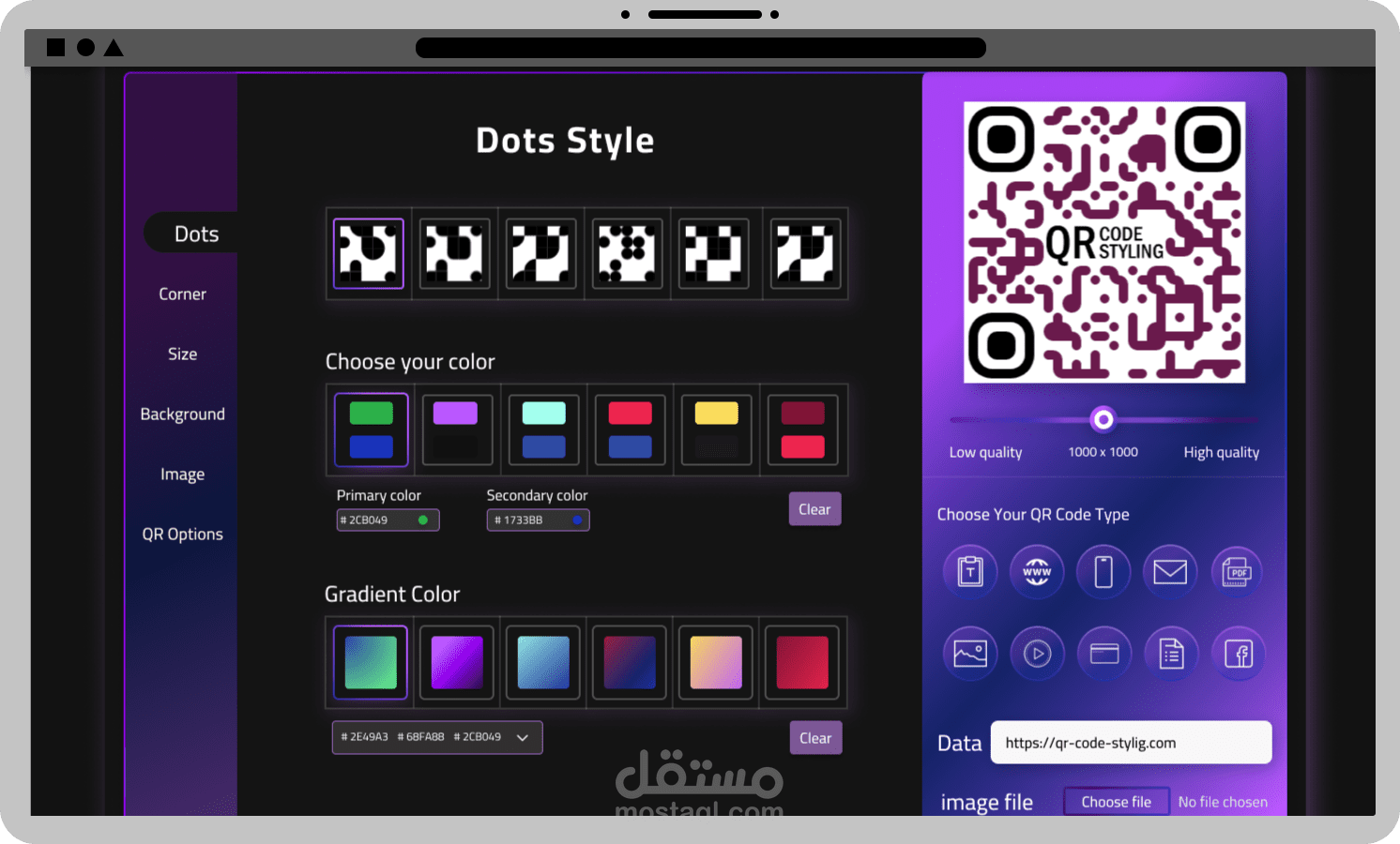 هو تطبيق بإنشاء رمز الاستجابة السريعة الخاص بعلامتك التجارية عبر الإنترنت، ويمكنك إضافة صورة ولون إلى رمز الاستجابة السريعة الخاص بك. استخدم مكتبة تصميم رمز QR في موقعك لإنشاء رموز QR ديناميكيًا.