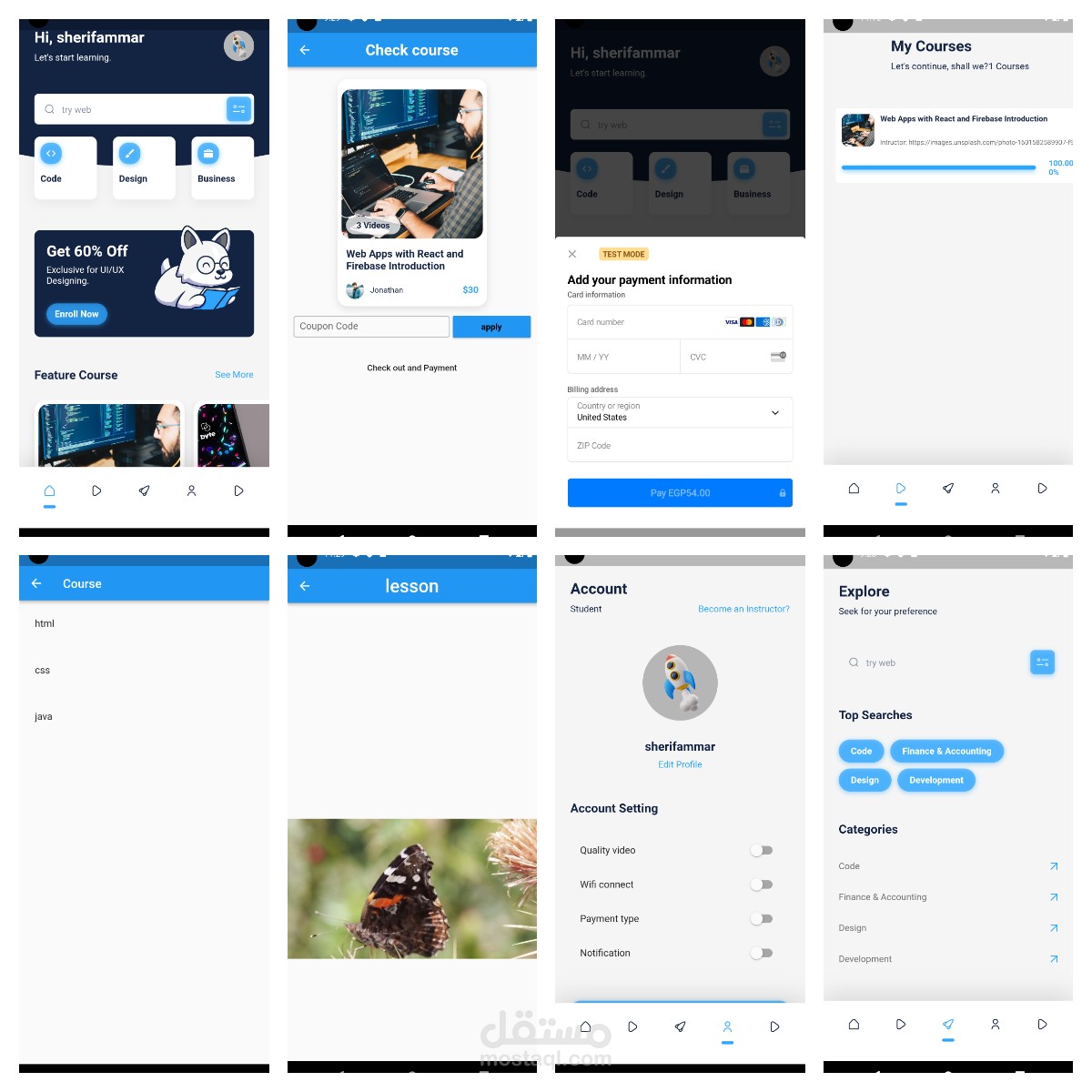 يقوم المستخدم بتسجيل الدخول و اختيار course معين و الدفع الكترونى