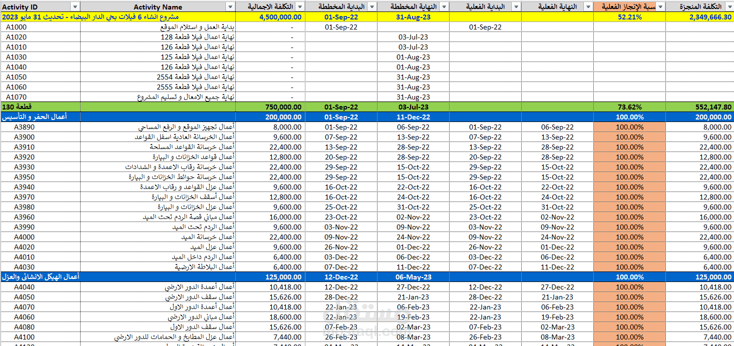 اعداد الجدول الزمني للمشروع و حساب نسب الانجاز المخططة و مقارنتها بالفعليه و التكلفة المحققة و الاجمالية للمشروع