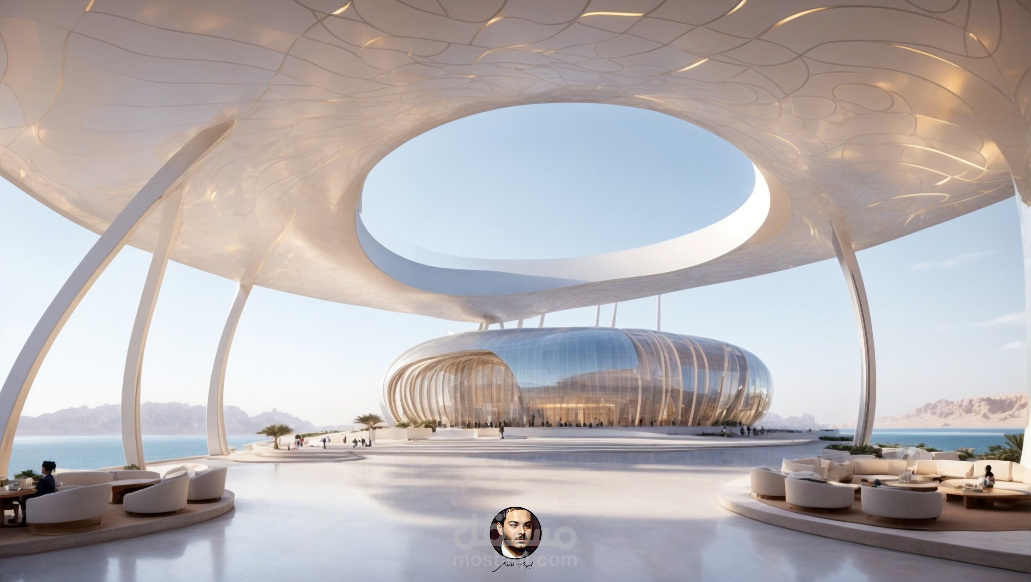 The design highlights the endless fascination of the sky, as the color of the sky and the horizon are integrated into the architectural elements. Decorated glass is used with unique geometric shapes inspired by the stars in the sky and planetary formations.