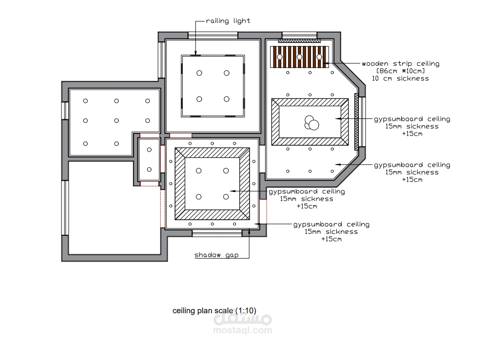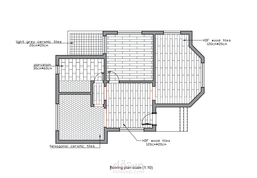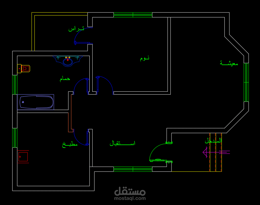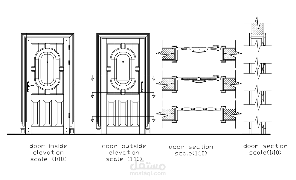 مخططات لتوزيع الأثاث وتصميم الأسقف والأرضيات لشقة دور أرضي مساحة 70 متر مربع. مع تصميم لباب المدخل والمخططات التنفيذية.