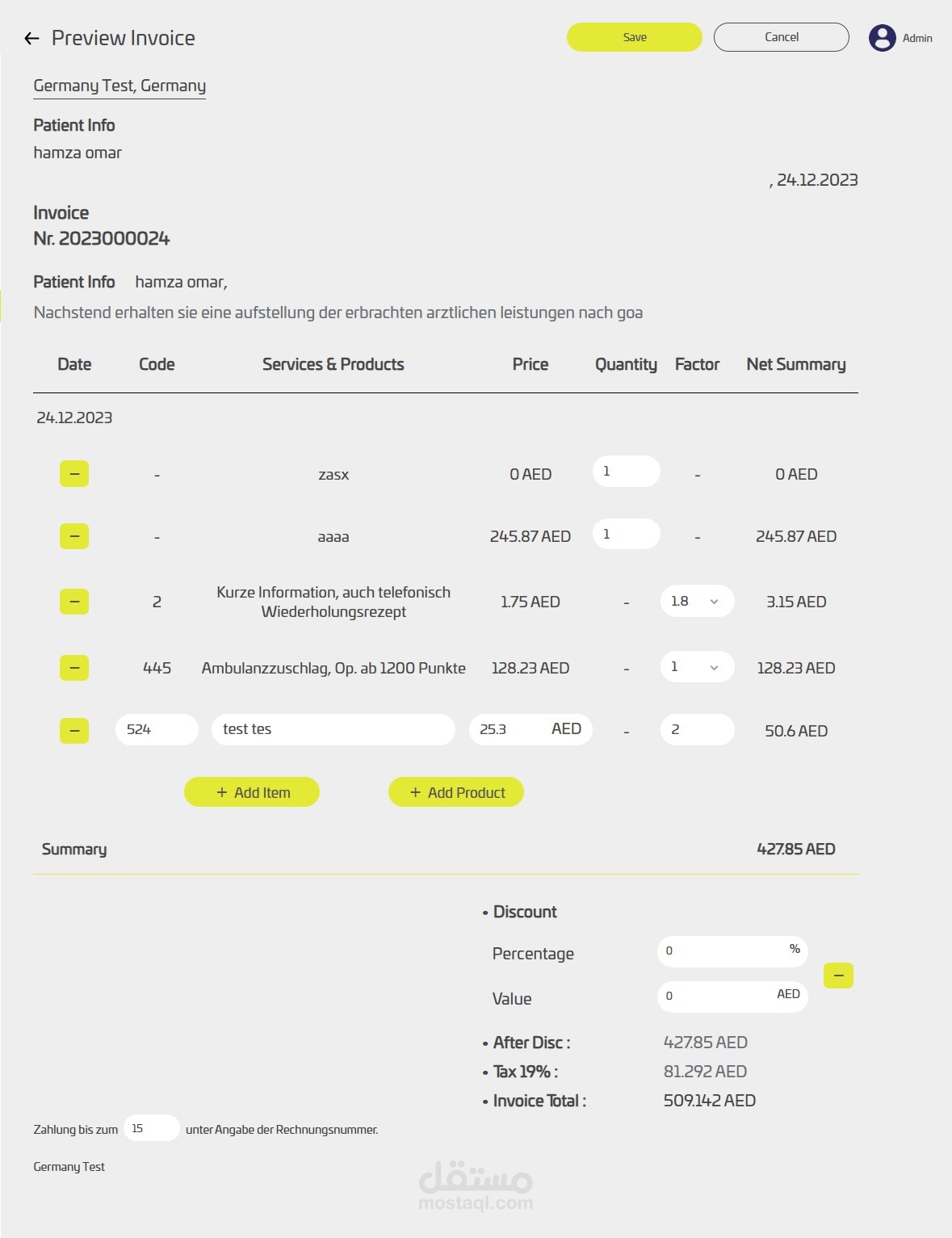 يوجد نموذج آخر للفواتير حيث يمكن للمستخدم تحرير الفاتورة والتعديل على تفاصيلها من منتجات وخدمات وخصم.