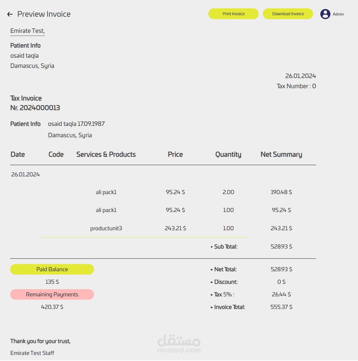 هذه الصفحة مختصة بعرض فاتورة بالموعد متضمنة الخدمات والمنتجات التي تم تقديمها ضمن الموعد مع قيمة الخصم والضريبة اذا كانت موجودة.