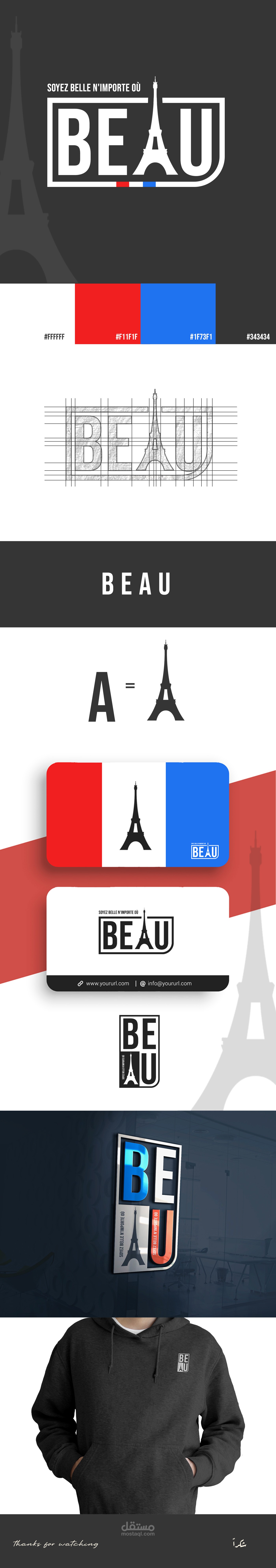 تصميم شعار logo لشركة جديدة باسم "BEAU" "جميل" ، والتي تختص في الملابس و الازياء الكاجوال و الكلاسيك، بما في ذلك و اتت فكرة اللوجو من باريس حيث باريس تعرف بالاناقة و الفن و الملابس ، وتم دمج برج ايفيل الى اللوجو لتذكار باريس و استخدام الوان علم باريس و هم (الاحمر و الابيض و الازرق)