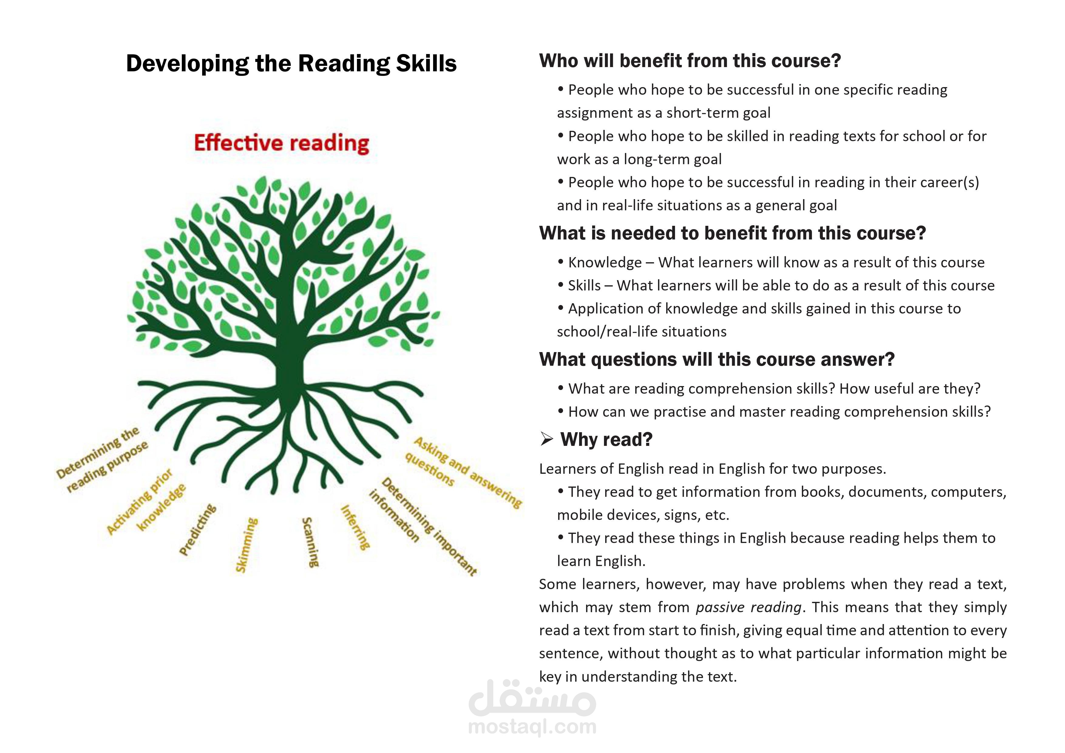 'Developing the Reading Skills' هو مشروع كتابة محتوى لتعلّم الانجليزيّة أنجزته حديثا على 'مستقلّ'.